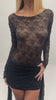 A renda tem desenho floral, mas com leitura mais irregular, quase como uma teia, criando um visual menos romântico e mais rebelde. O decote com acabamento levemente esgarçado reforça essa estética, trazendo um ar despretensioso e marcante.