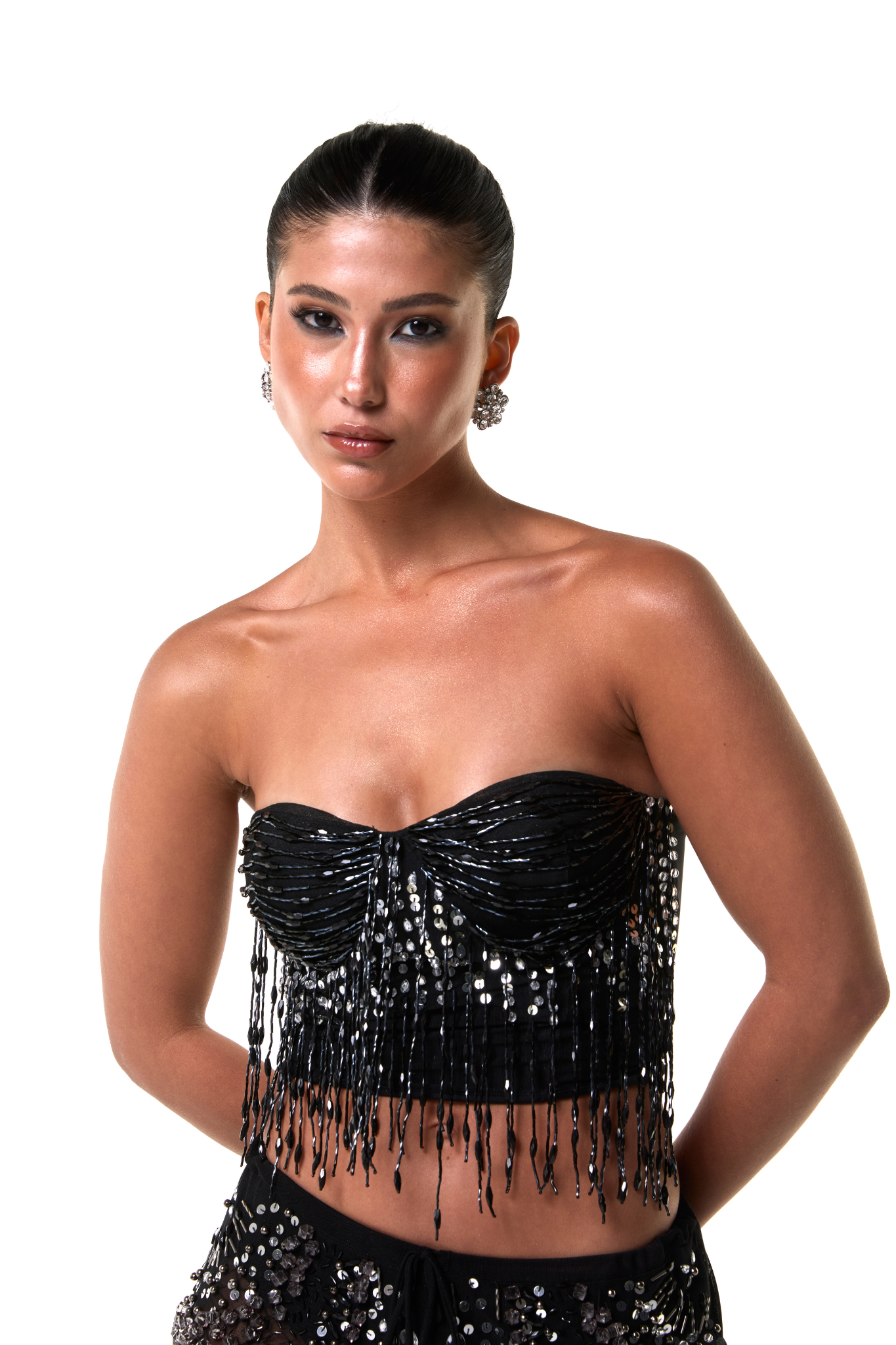 O Corset Acqua é estruturado no busto com barbatanas e bojo para sustentação no busto e todo coberto por bordados manuais: uma composição rica de vidrilhos, cristais, canutilhos e paetês que criam um visual com brilho e textura em movimento. A peça possui franjas bordadas em toda a sua extensão. Nas costas o Corset possui ilhós com amarrações para se adaptar melhor em diferentes bustos.