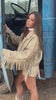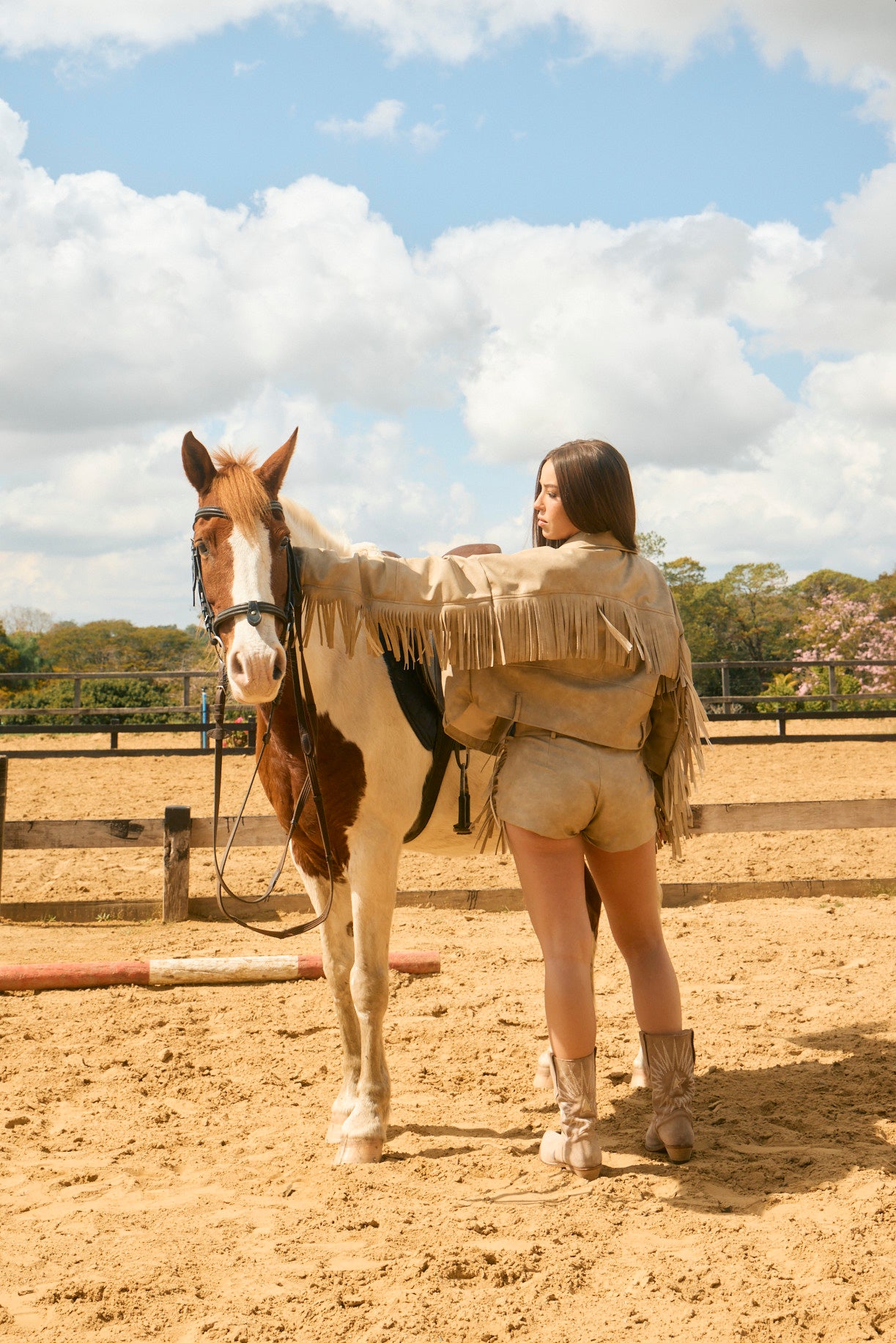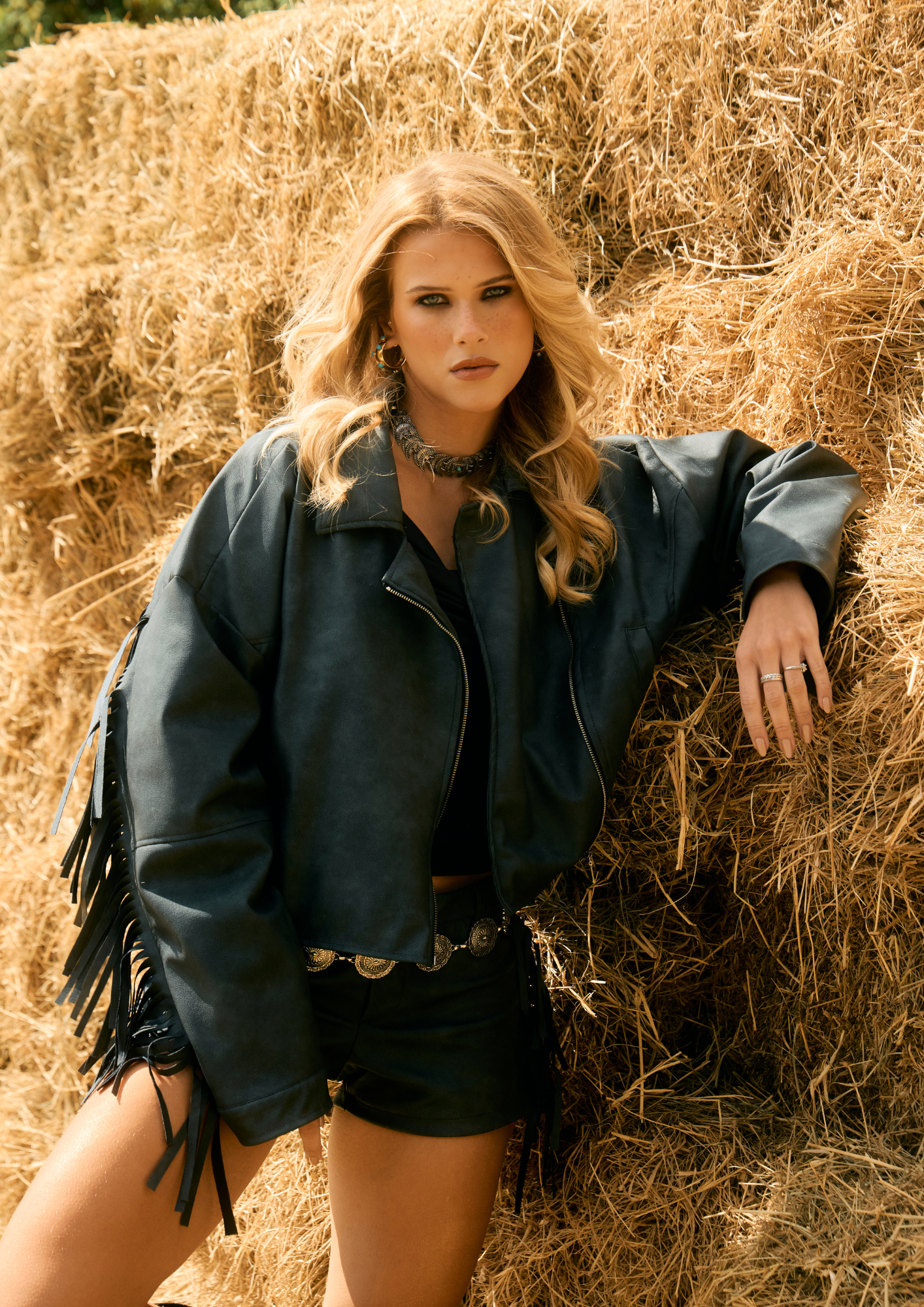 A Jaqueta Franjas é aquela peça statement que transforma qualquer look. Confeccionada em couro PU macio, ela tem zíper de metal frontal, botões nos punhos e bolsos laterais. O comprimento é mais curto, a modelagem é oversized e as franjas cortadas a laser nas mangas e costas garantem movimento e estilo. Preto é puxando para um cinza estonado.
