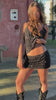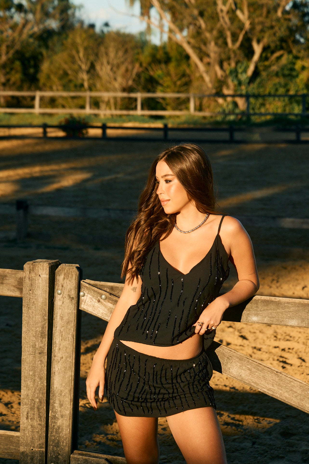 Possui cintura média, comprimento mini e fechamento por zíper invisível na lateral. Toda a peça é bordada manualmente com canutilhos pretos, formando um mosaico detalhado e sofisticado. Ideal para produções noturnas e eventos especiais.