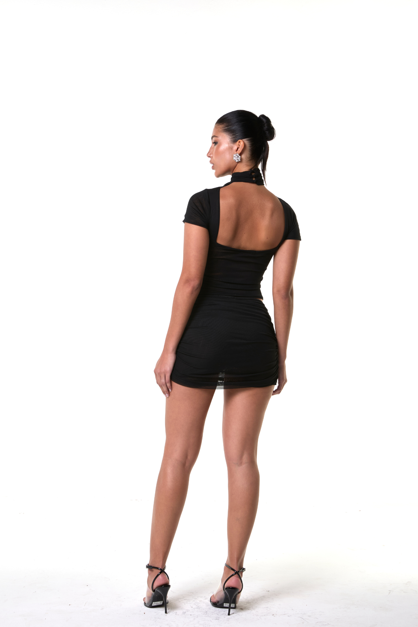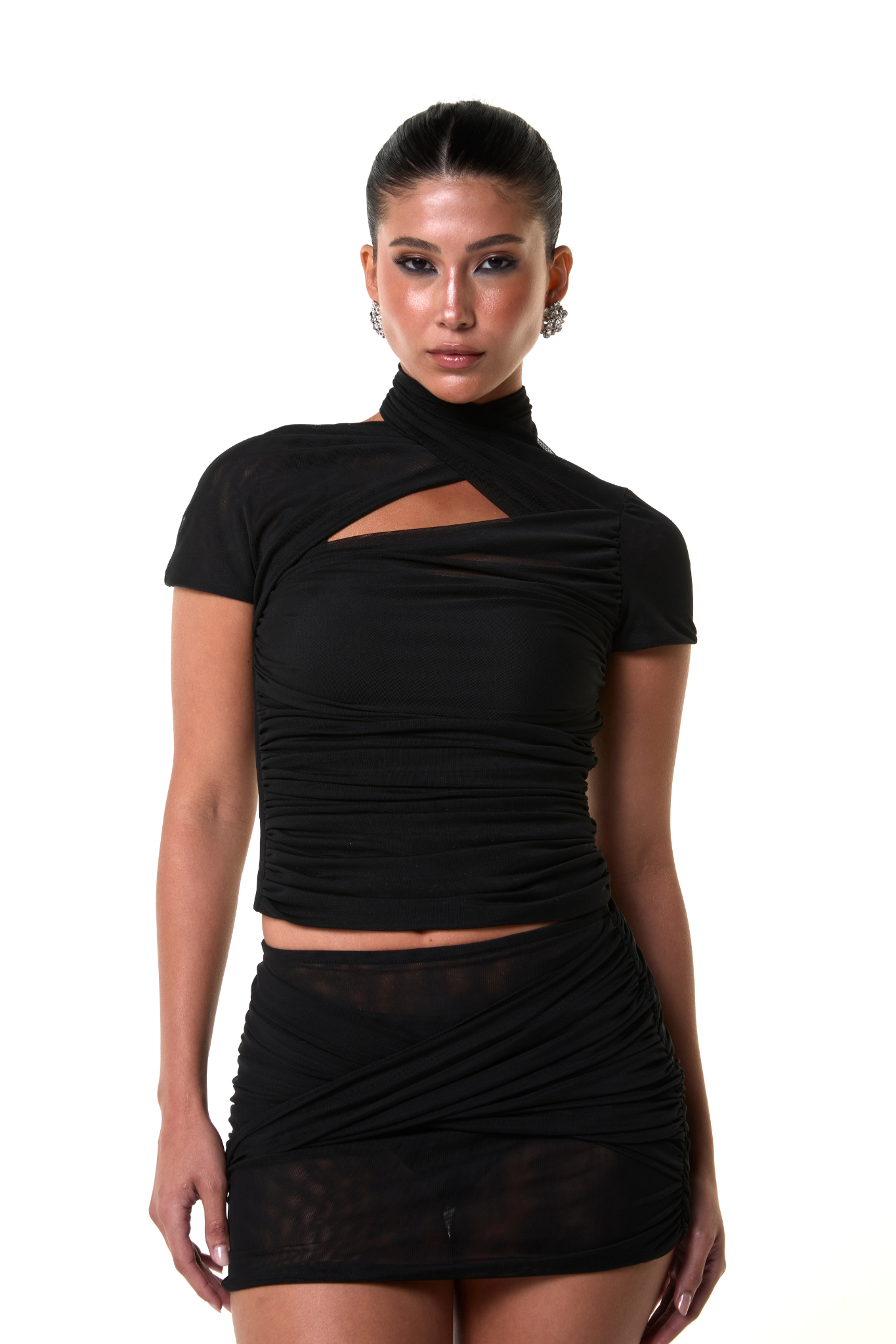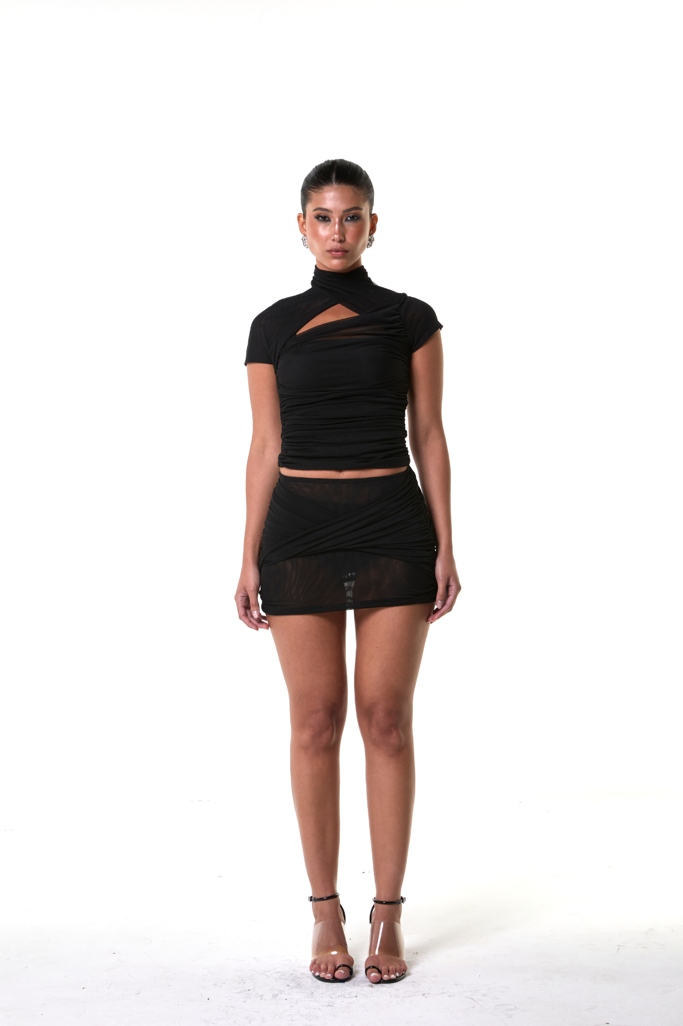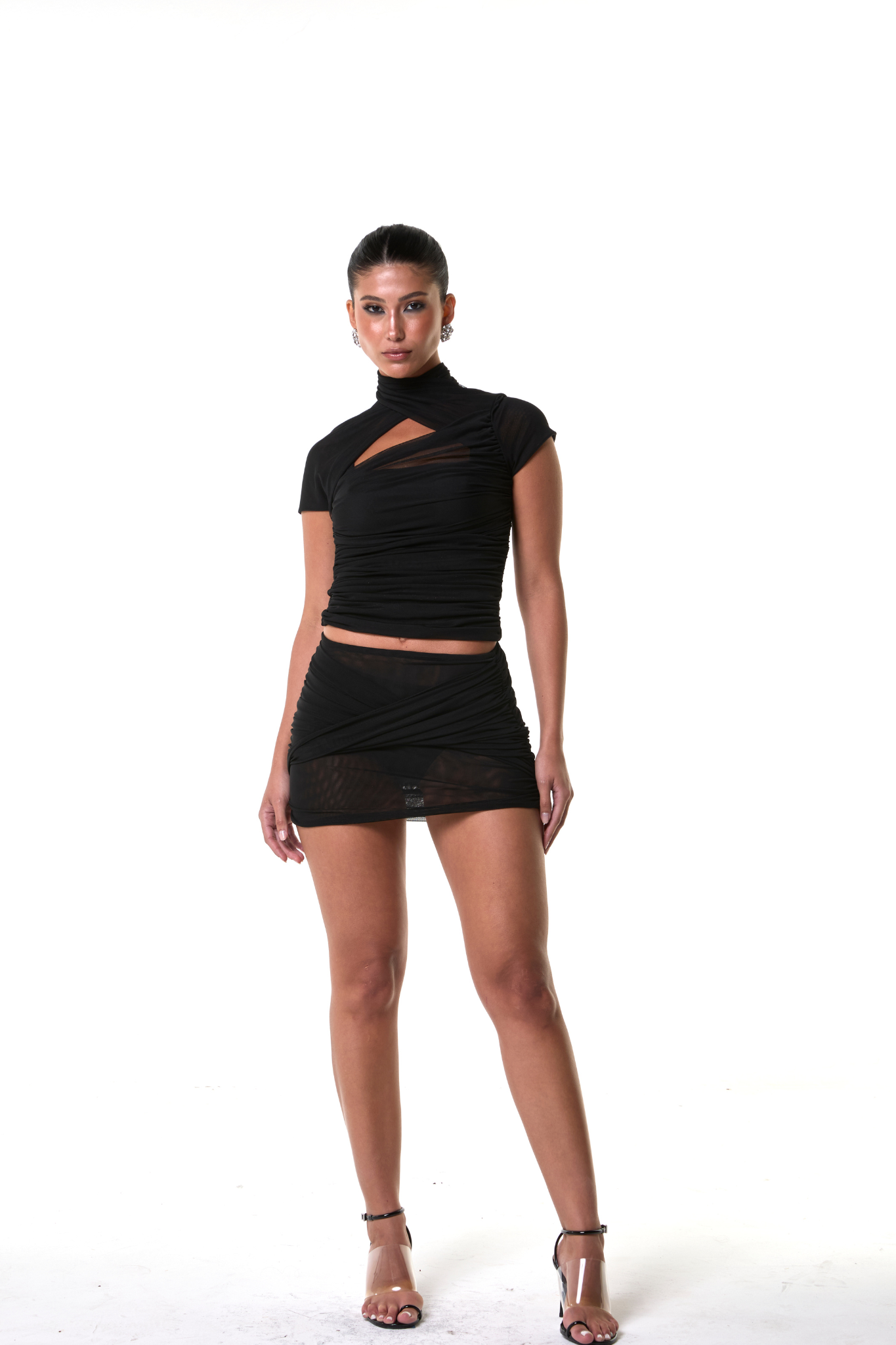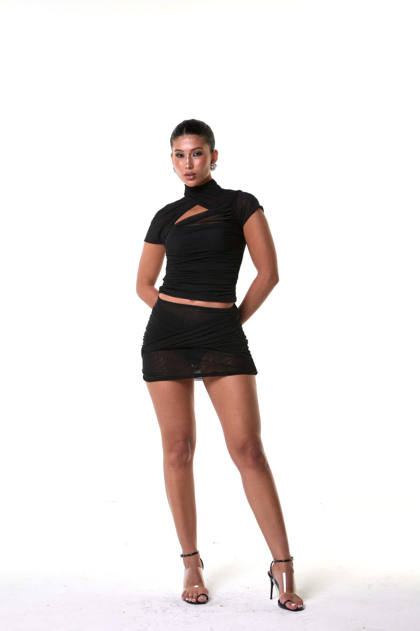 A construção com camada dupla de tule garante mais estrutura e conforto, sem perder a leveza e transparência que fazem parte da estética ousada da peça. O tecido acompanha o movimento com fluidez, enquanto os drapeados laterais e o elástico embutido no cós garantem um caimento impecável e seguro.