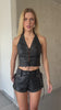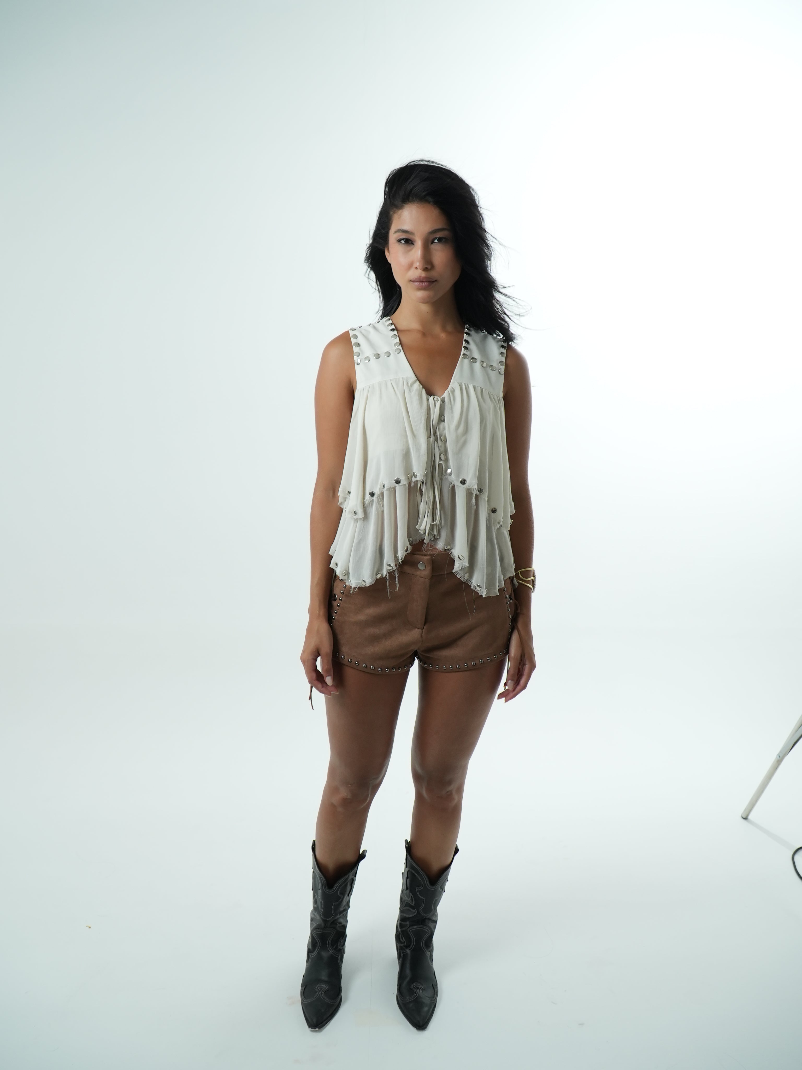 The Gypsy Mini Shorts have a mid-rise design and a strategic cutout on the butt – they are still mini, but without revealing too much lol. The studded detail and side tie make all the difference, creating an incredible look.