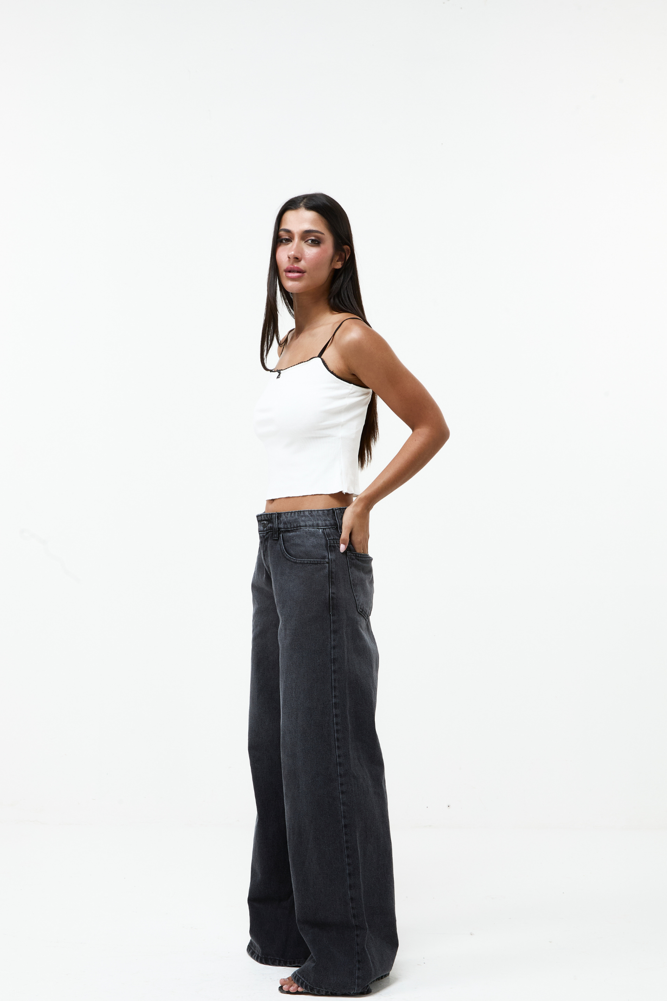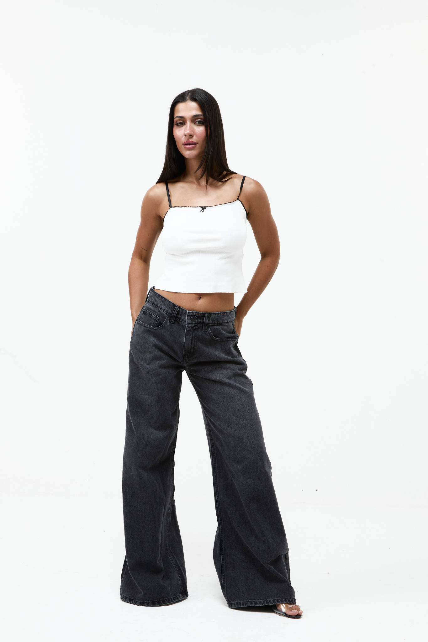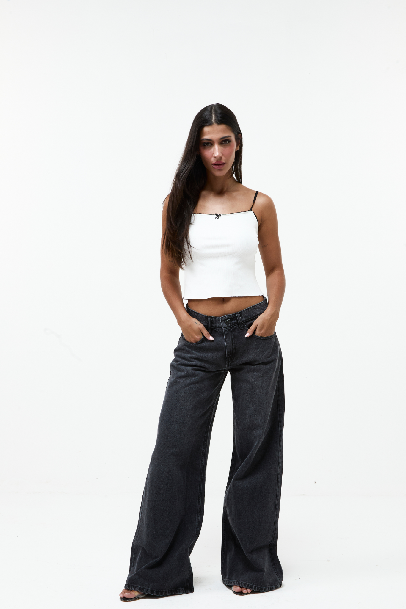 A Regata Branca Laço é o básico nada básico. Feita em malha, ela tem alcinhas finas e recorte reto que valorizam o colo com elegância. O detalhe em acabamento preto e o mini laço central dão o contraste perfeito entre o cute e o bold.