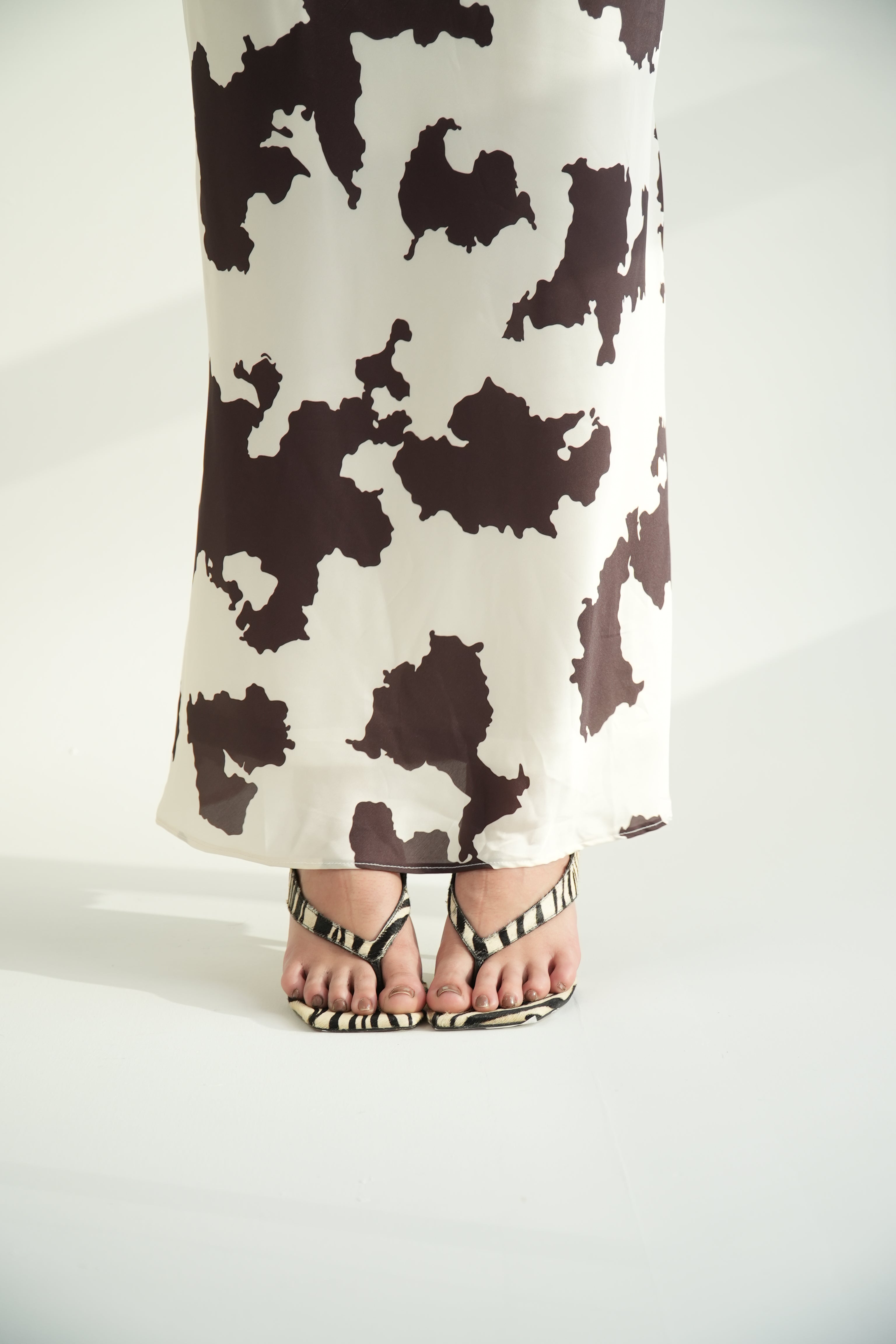 The Silk Cow Long Skirt has a light and perfect fit, made of Silk Satin, a fabric that resembles silk in feel and movement. The lining ensures that it is not transparent, so you can wear it without worries (the fabric composition has 3% elastane, so the piece has a slight elasticity).