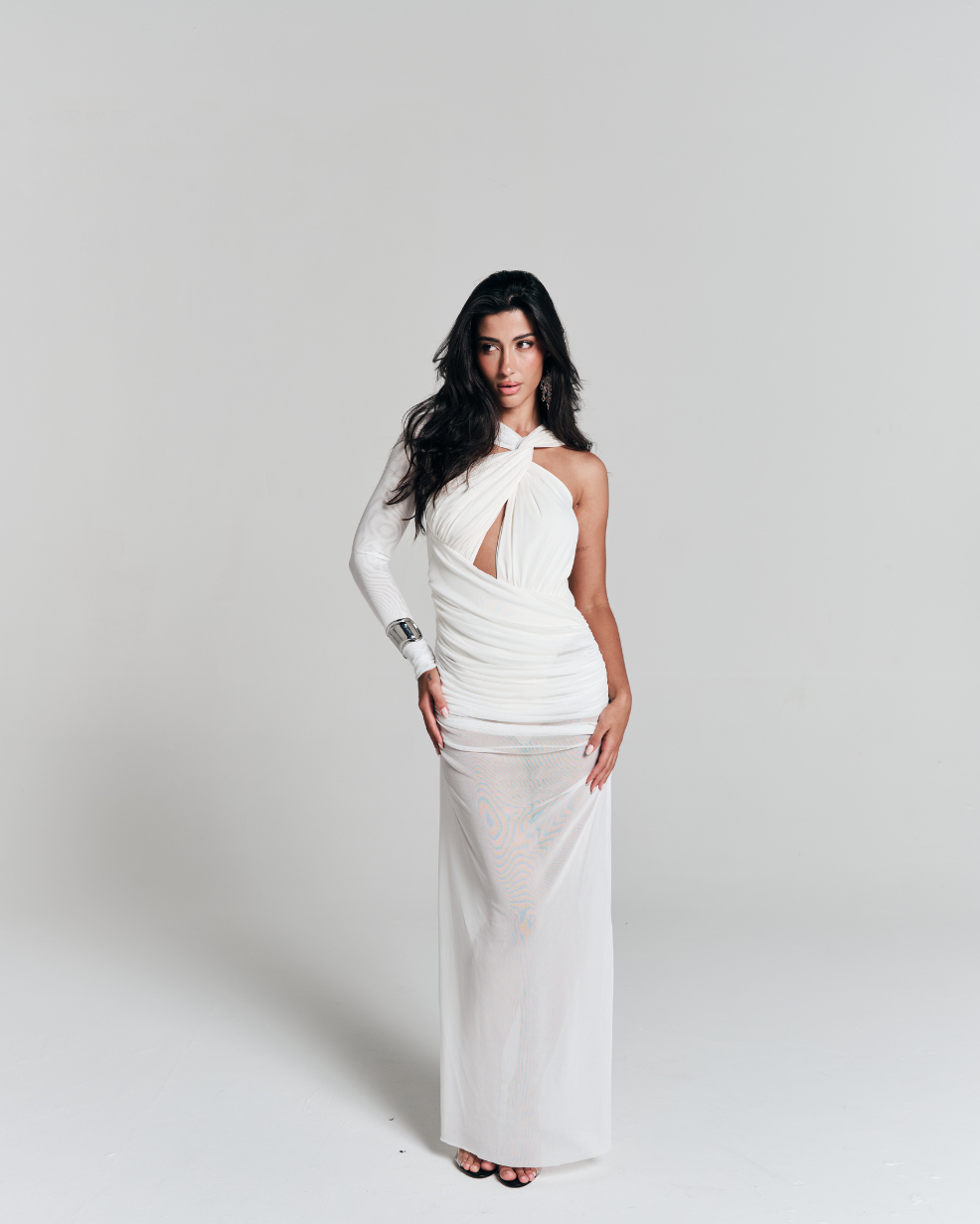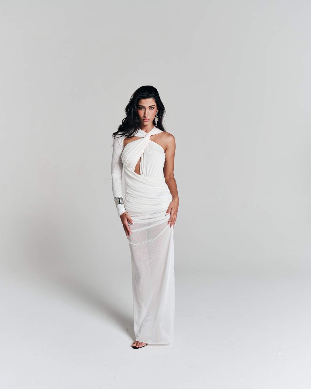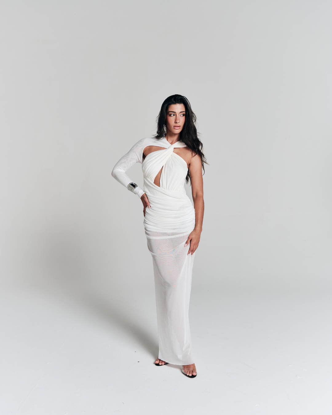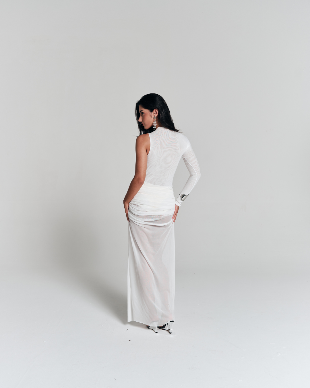 PRAZO DE POSTAGEM: 14 DIAS ÚTEIS. O Vestido One Shoulder Longo é confeccionado em tule com forro de poliamida ultralight no busto, tem caimento justo ao corpo e comprimento longo. A peça possui detalhe de nó frontal, drapeados nas laterais da saia, forro em poliamida ultralight somente no busto, fecho de body e comprimento longo