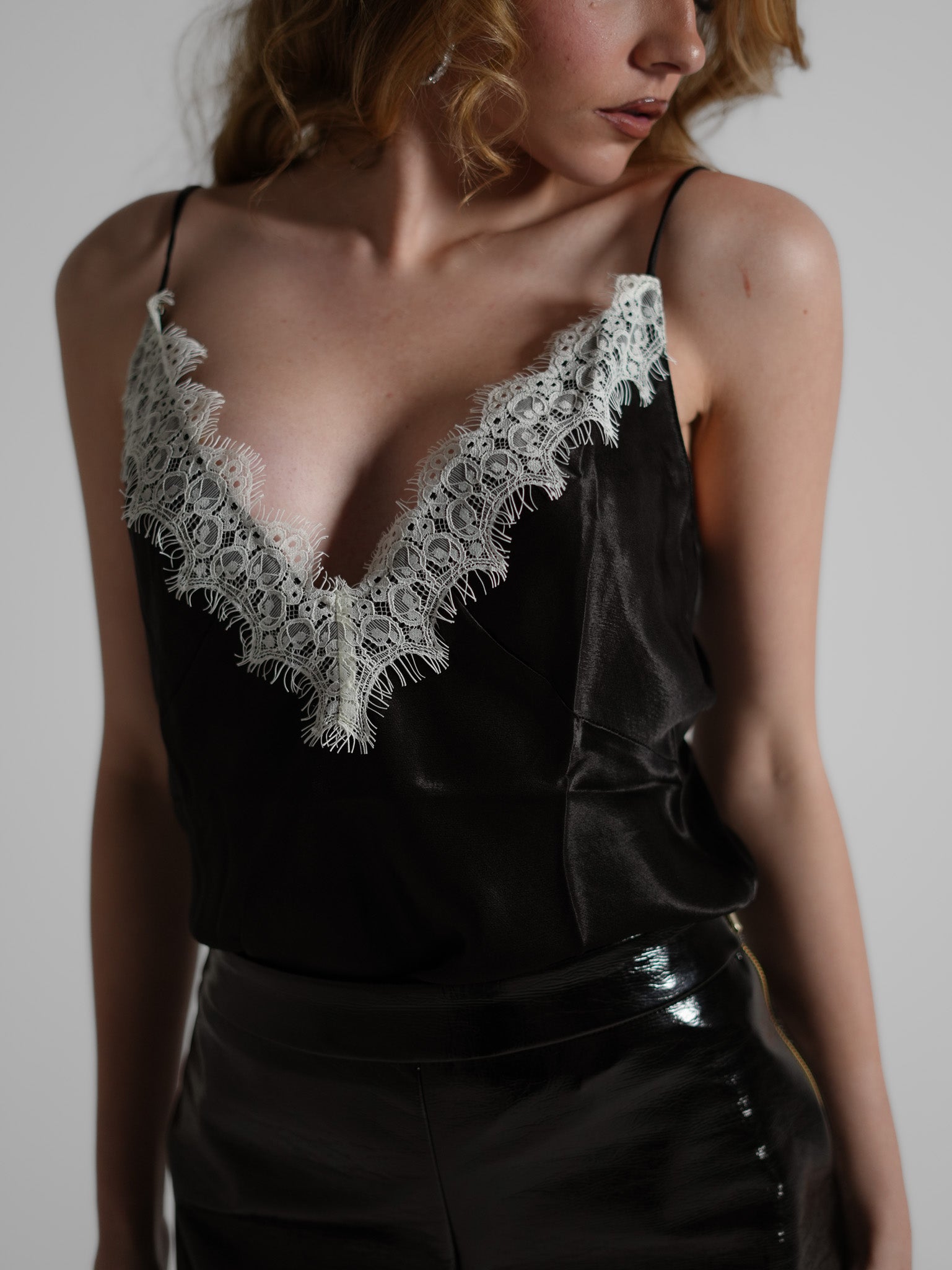 The Temptation Lace Tank Top is made of satin with a slight sheen and a soft drape. The tank top has a V-neckline with lace trim, thin adjustable straps, and a loose fit.