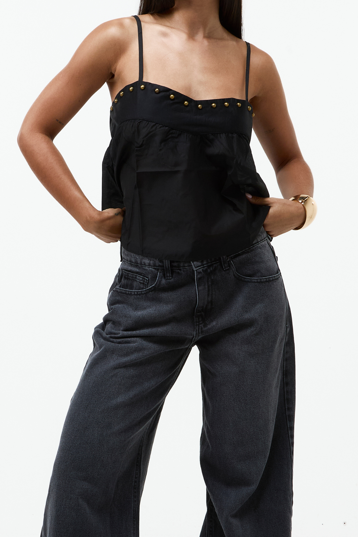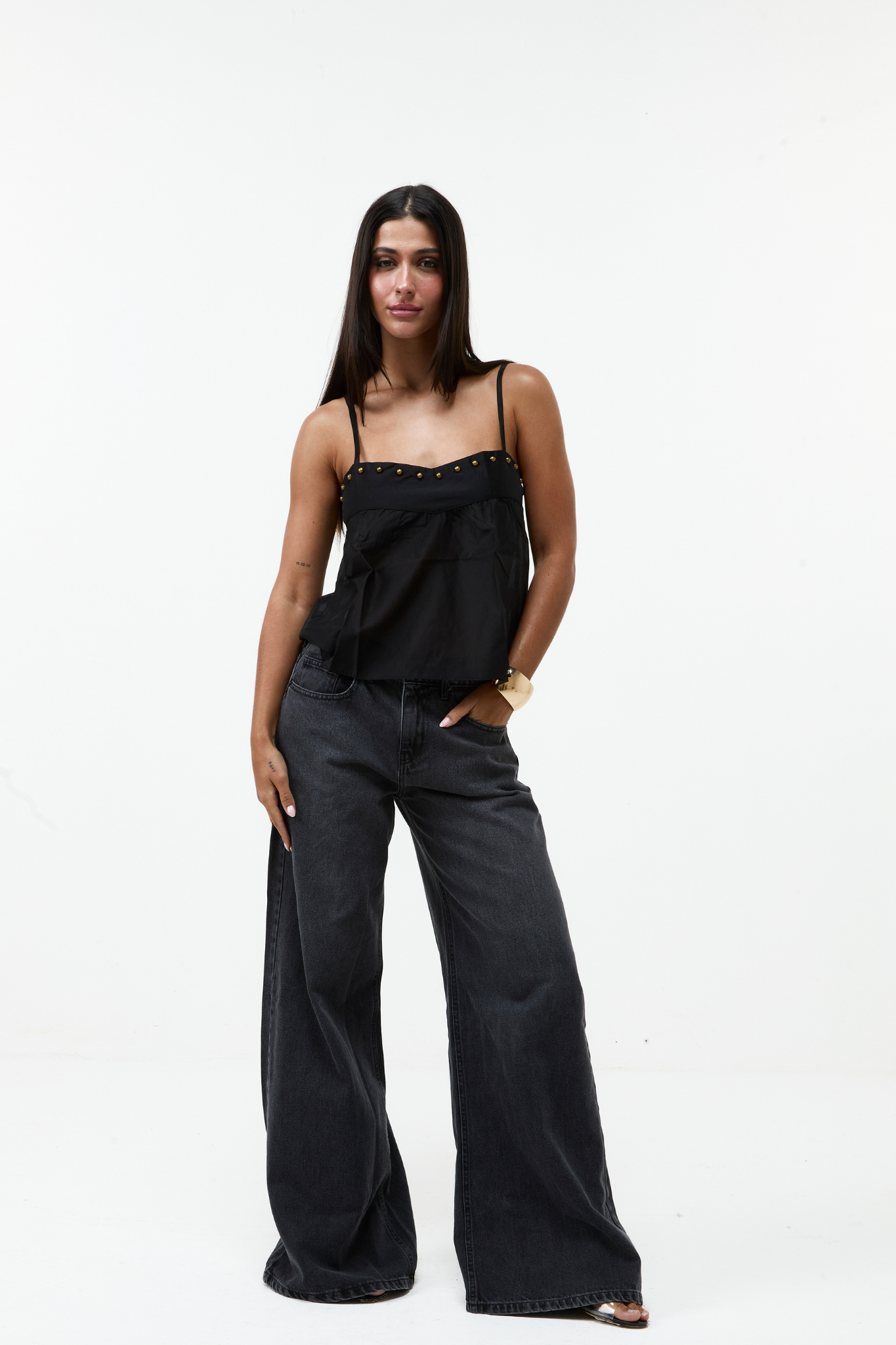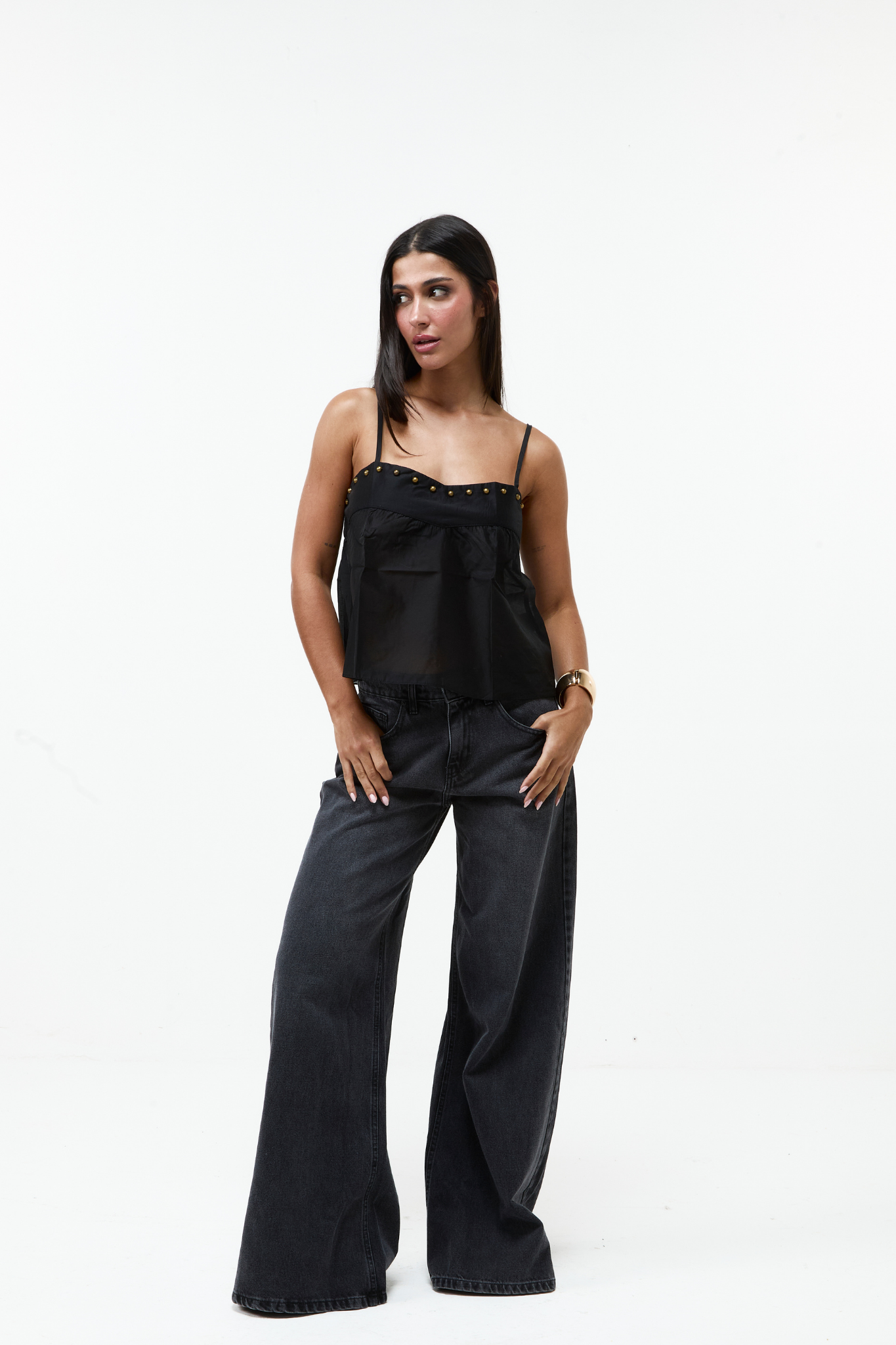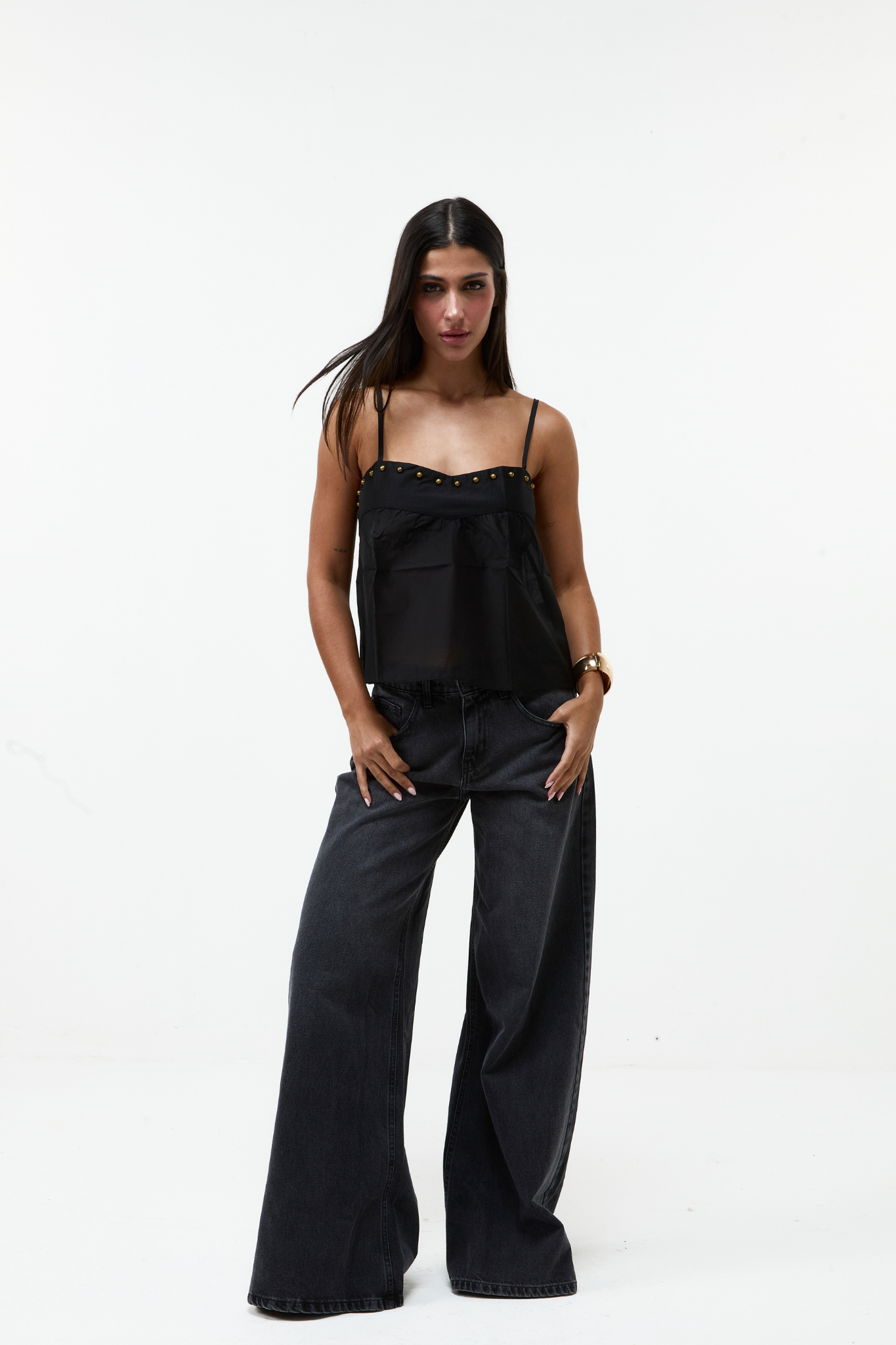 A Regata Tachas é aquela peça básica com personalidade. Confeccionada em tecido leve de toque acetinado, traz decote reto com aplicação de tachas metálicas douradas que dão o toque bold do look.