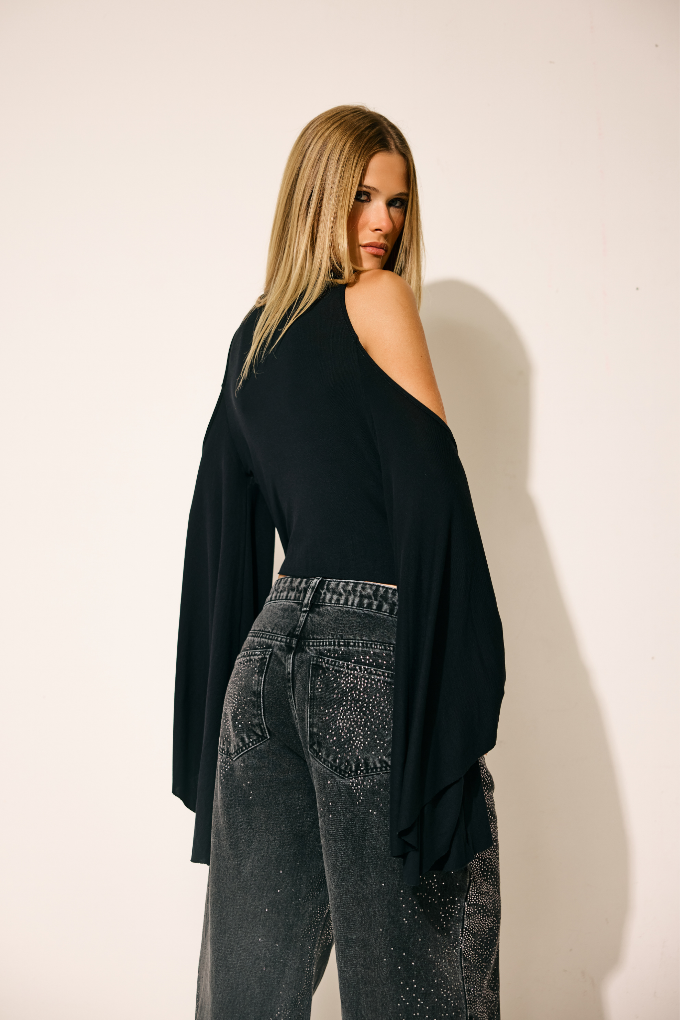 O decote profundo valoriza o colo e traz sensualidade, enquanto as mangas amplas adicionam dramaticidade e presença. A abertura estratégica nos ombros revela a pele e reforça a estética marcante da peça, criando contraste entre fluidez e estrutura. A peça também possui detalhe drapeado na lateral que faz com que a blusa tenha esse caimento. Acabamentos em barra fio.