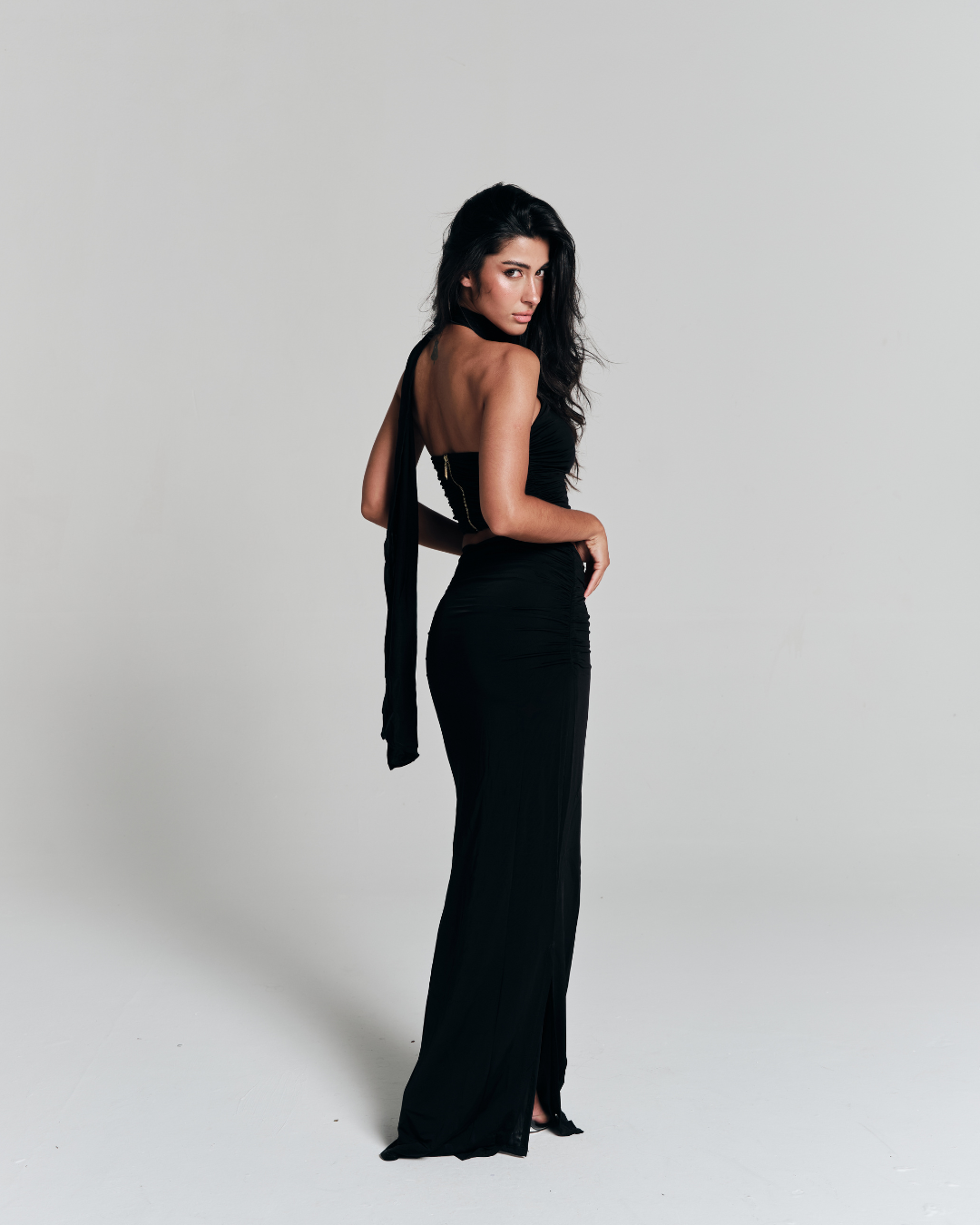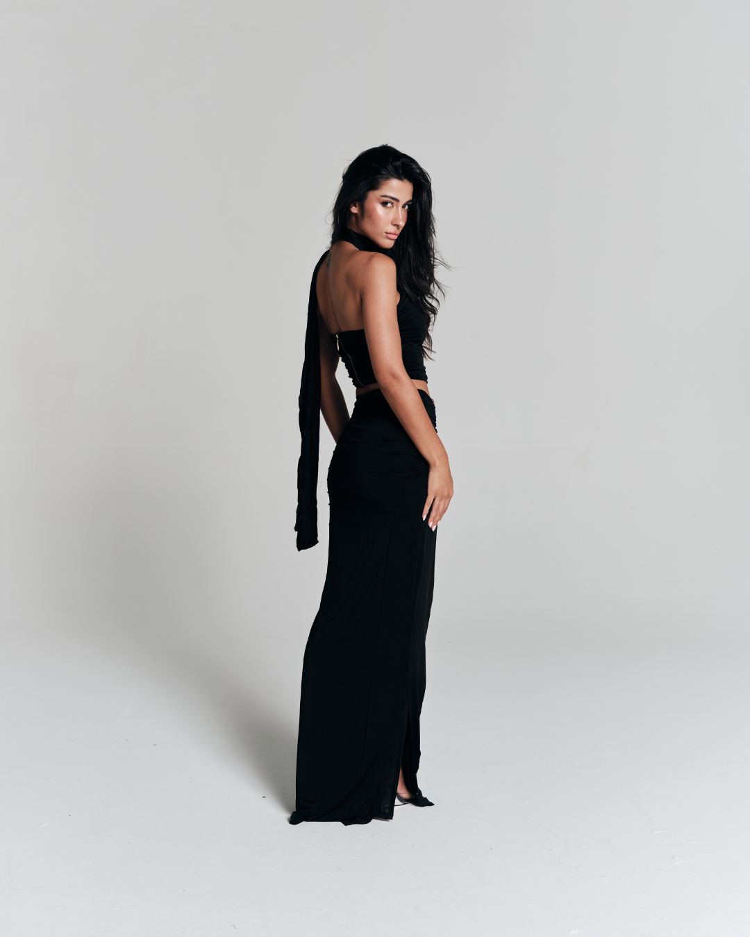 O diferencial está no aviamento frontal com faixa que permite amarração no pescoço, criando um efeito moderno e sensual. O design assimétrico e o comprimento equilibram elegância e ousadia