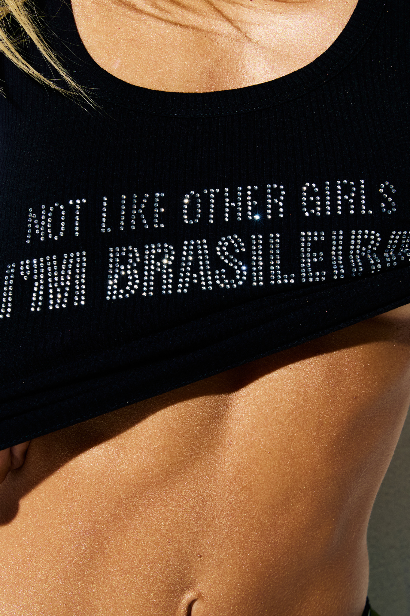 Na parte frontal, a frase “Not like other girls, I’m Brasileira” é aplicada em strass cristal prateado