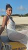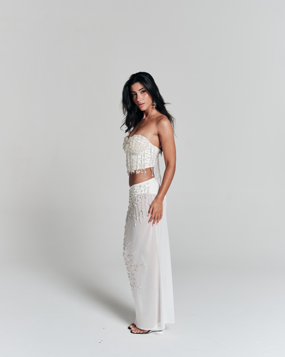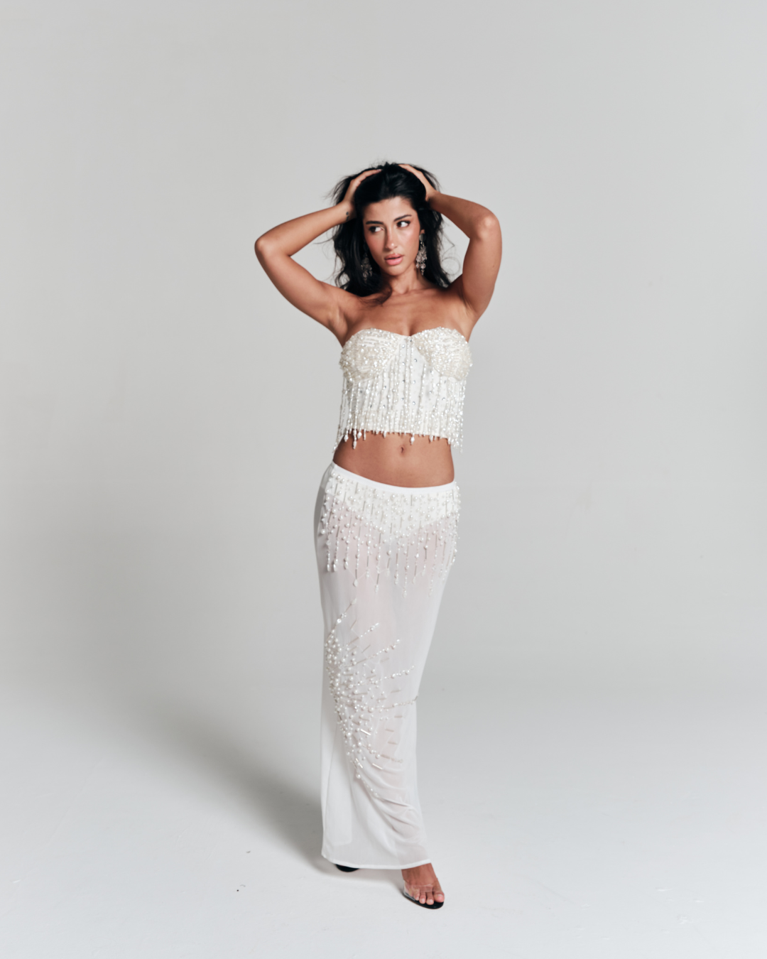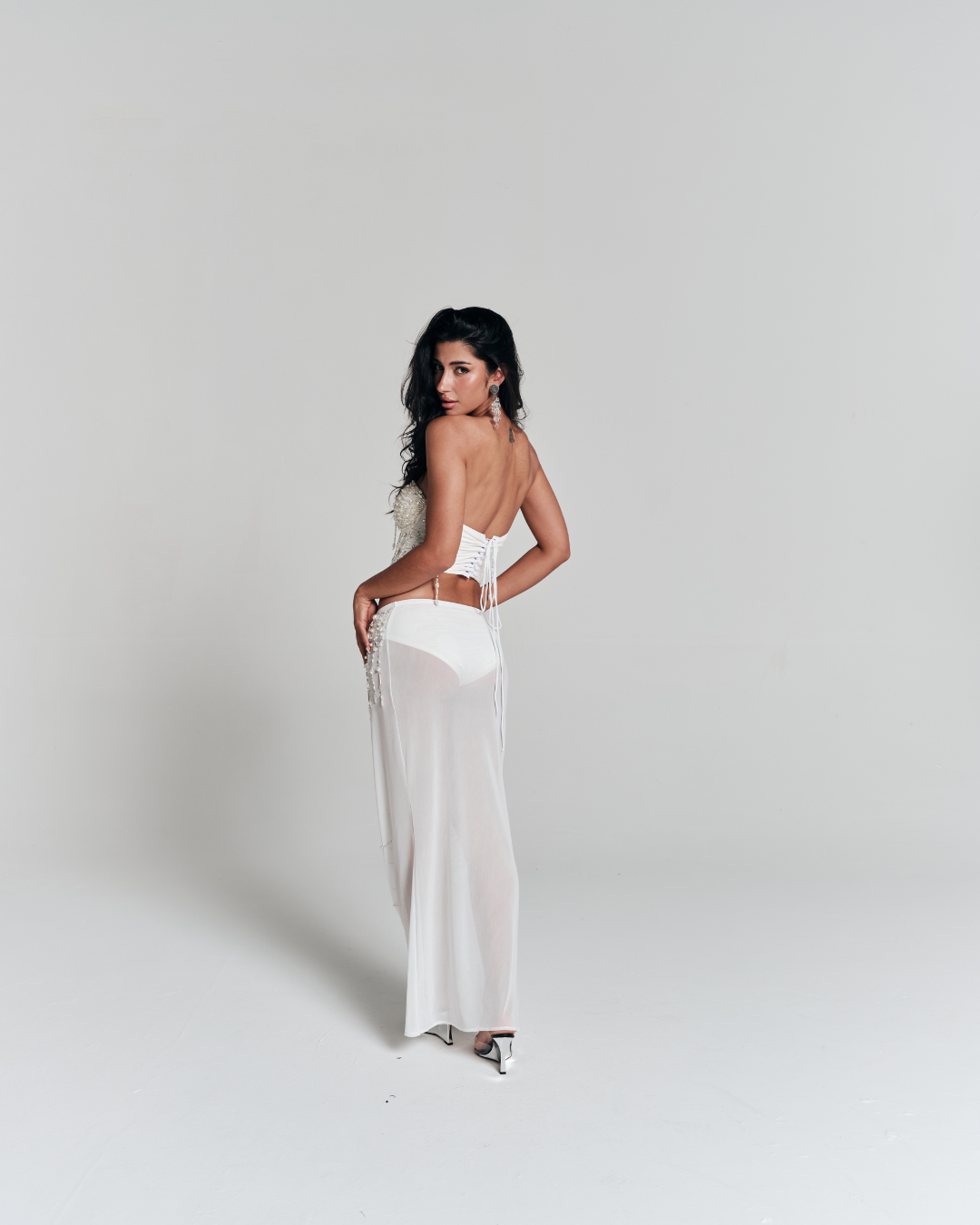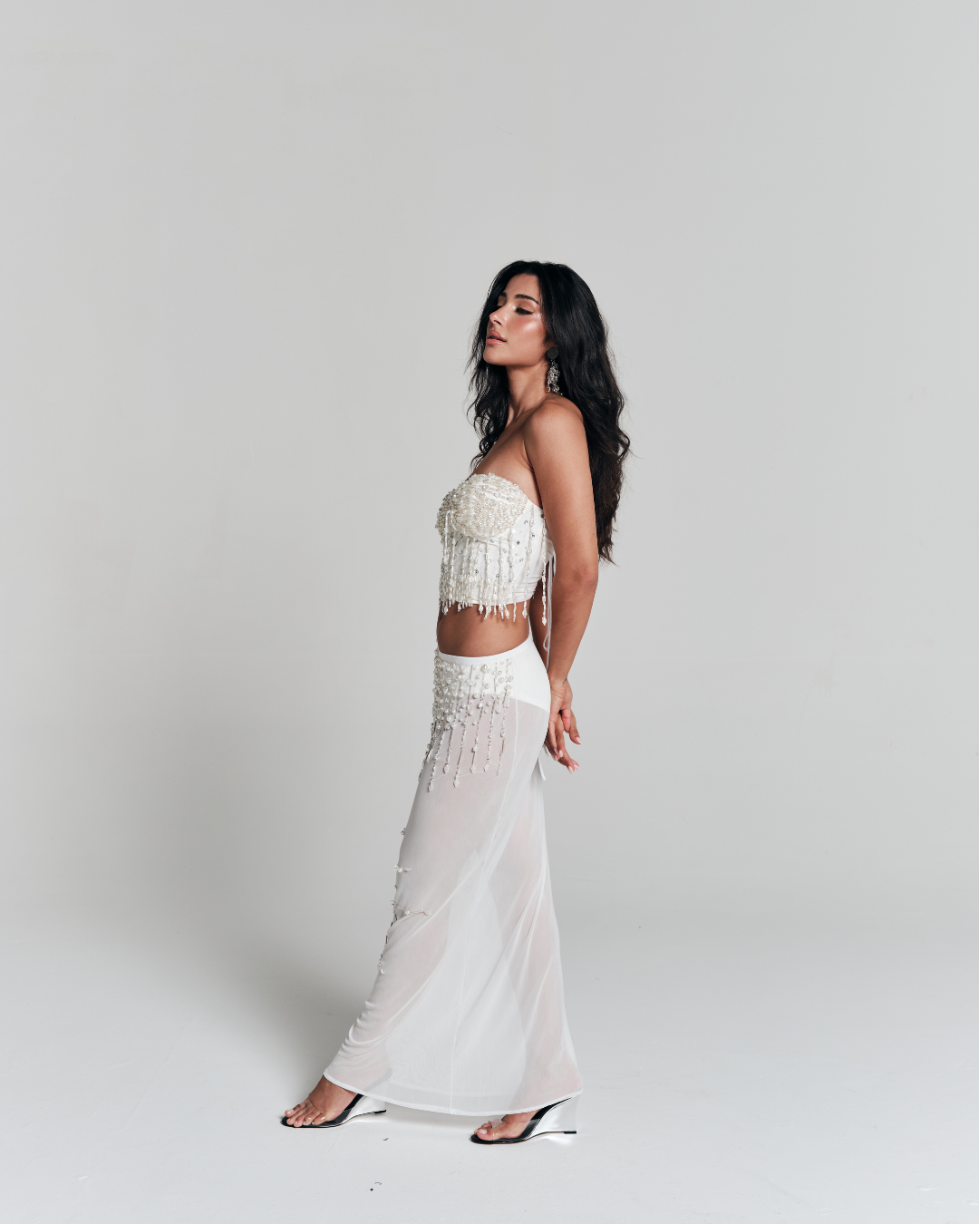 Na parte frontal, o bordado manual rouba a cena: uma composição rica de cristais, vidrilhos, paetês e canutilhos aplicados um a um.