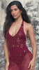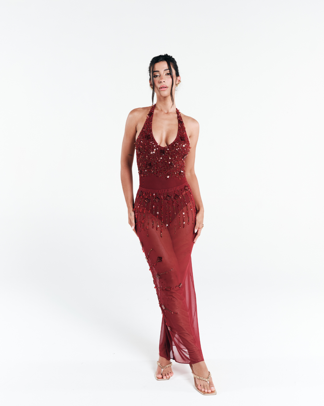 Na parte frontal, o bordado manual rouba a cena: uma composição rica de cristais, vidrilhos, paetês e canutilhos aplicados um a um.