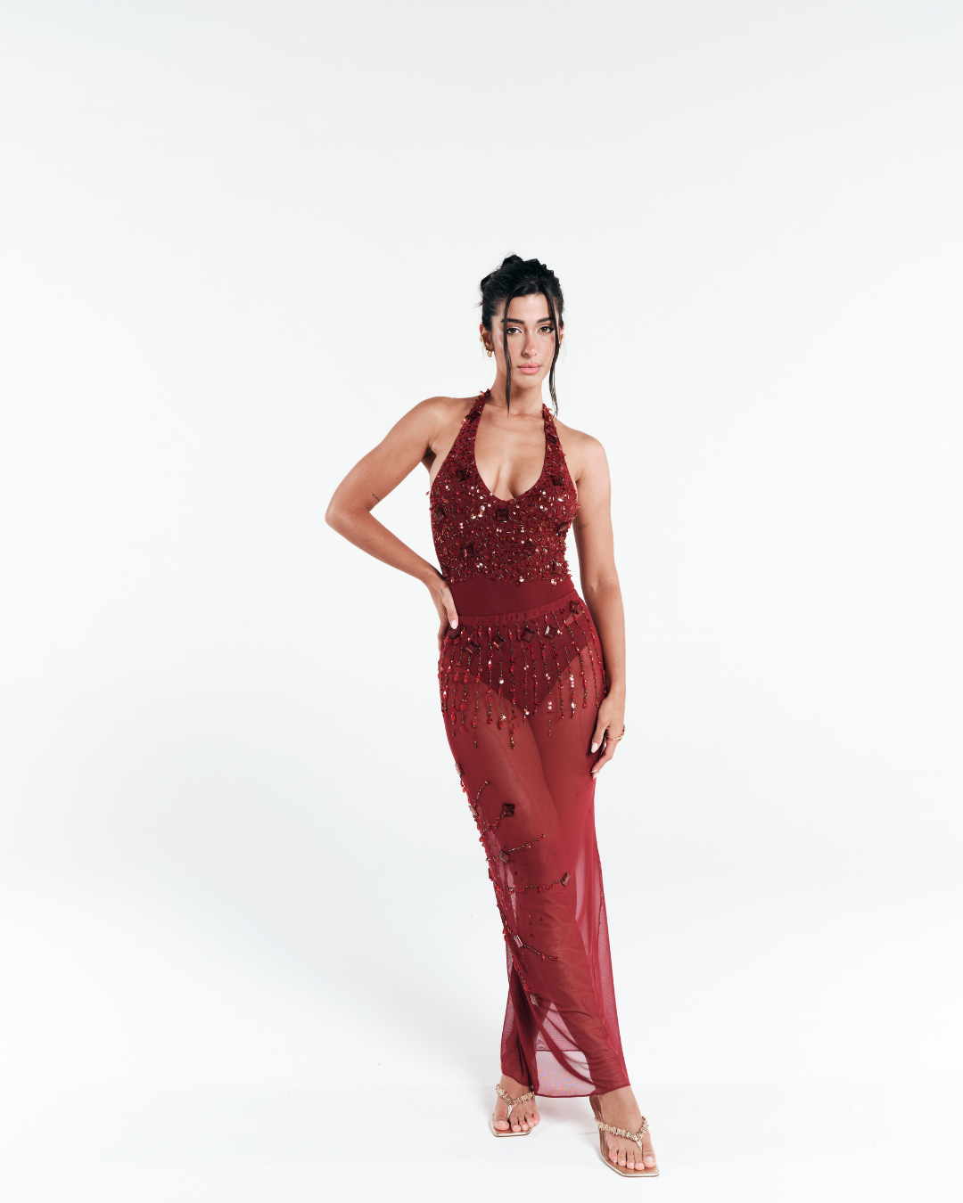 PRAZO DE POSTAGEM: 10 DIAS ÚTEIS. A Saia Longa Bordada Vermelha é feita em tule, com caimento fluido. A peça possui detalhes drapeados na lateral, fenda lateral e duas faixas (que você pode amarrar ou não).