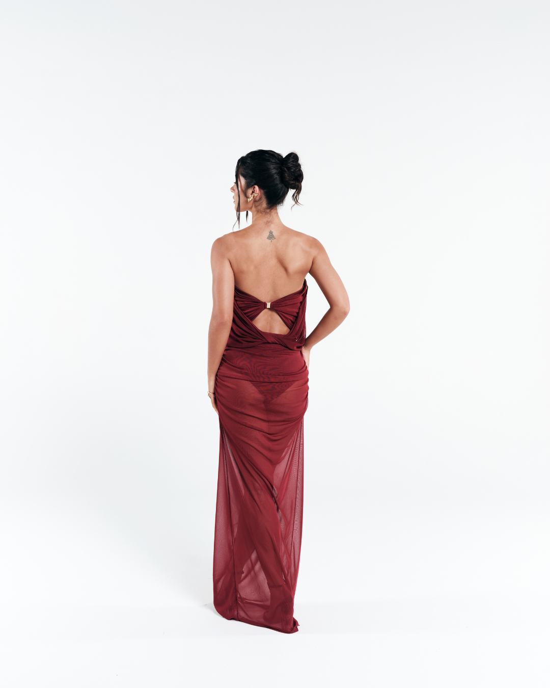 O modelo traz recorte frontal e detalhe drapeado na cintura, equilibrando volume e transparência. As tiras do busto permitem diferentes formas de amarração, possibilitando várias versões do mesmo vestido.