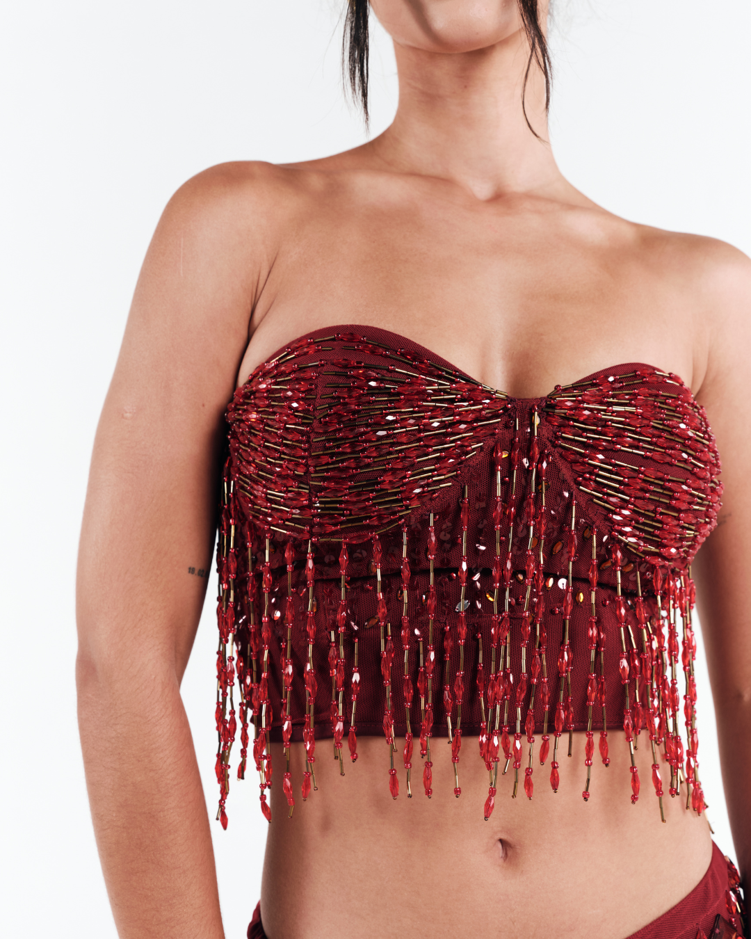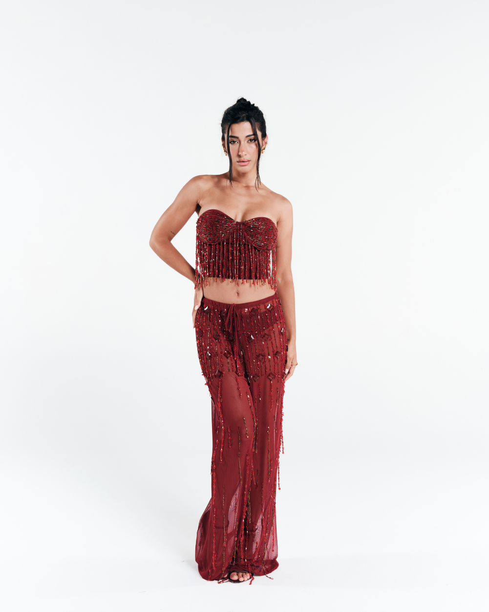 PRAZO DE POSTAGEM: 12 DIAS ÚTEIS. A Calça Bordada é feita em tule vermelho, com modelagem ampla, caimento leve e cintura ajustável por amarração no cós. O tecido translúcido ganha força com o contraste dos bordados manuais — uma composição de paetês, vidrilhos e canutilhos em tons de vermelho, ouro velho e marrom, aplicados um a um.