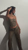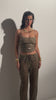 A Calça Elaris é confeccionado em tecido que imita uma trama natural com mini paetês bordados em toda a sua superfície. No cós da peça as tiras de amarração permitem a regulagem na altura ideal (podendo usar a peça cintura alta, média ou baixa). A peça acompanha calça em tule separadamento para usar de forro caso preferir.