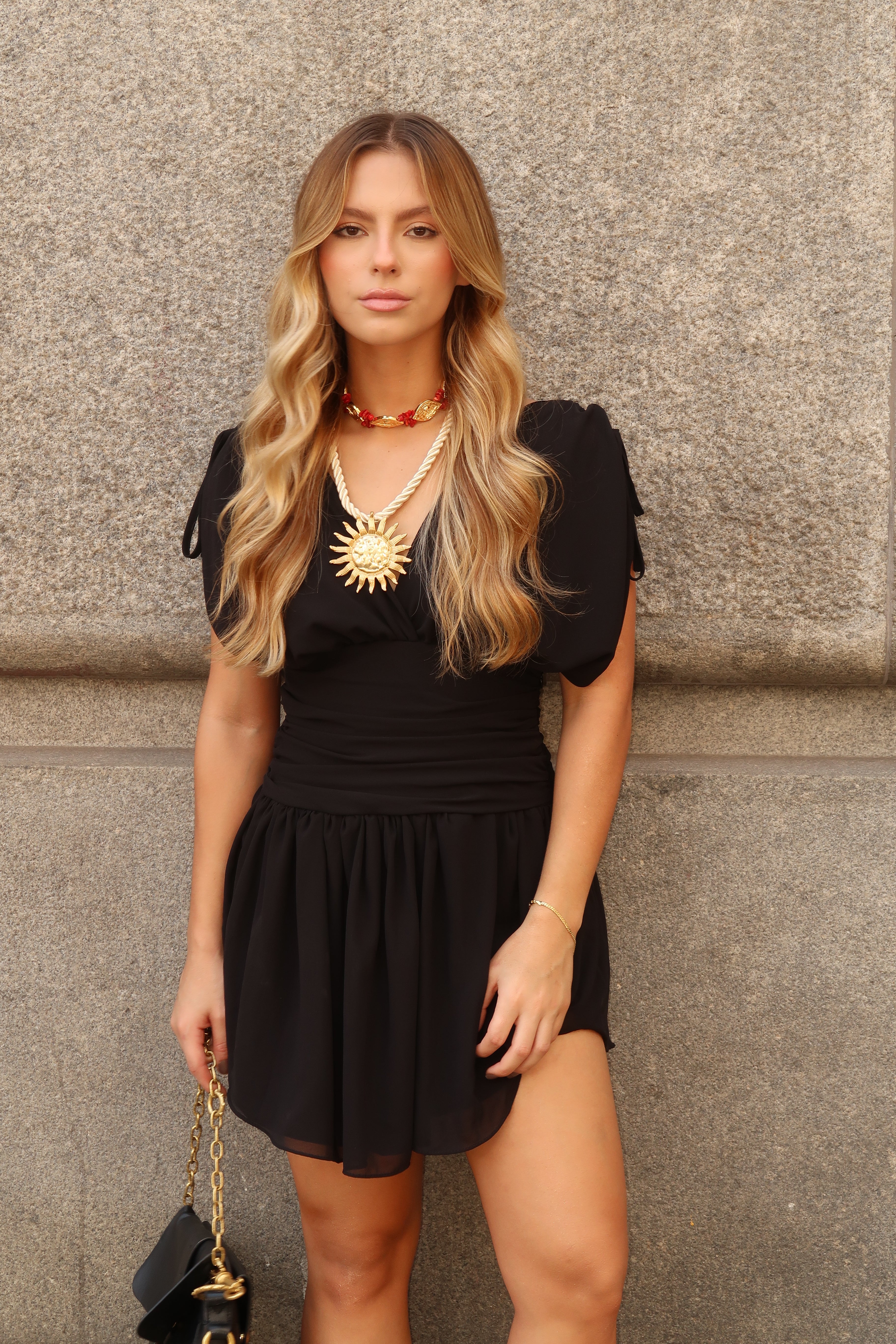 Dress made of crepe georgette, it has a draped waist with an invisible zipper on the side. Details on the shoulders of the dress with ties and a skirt with a rounded design (front and back)