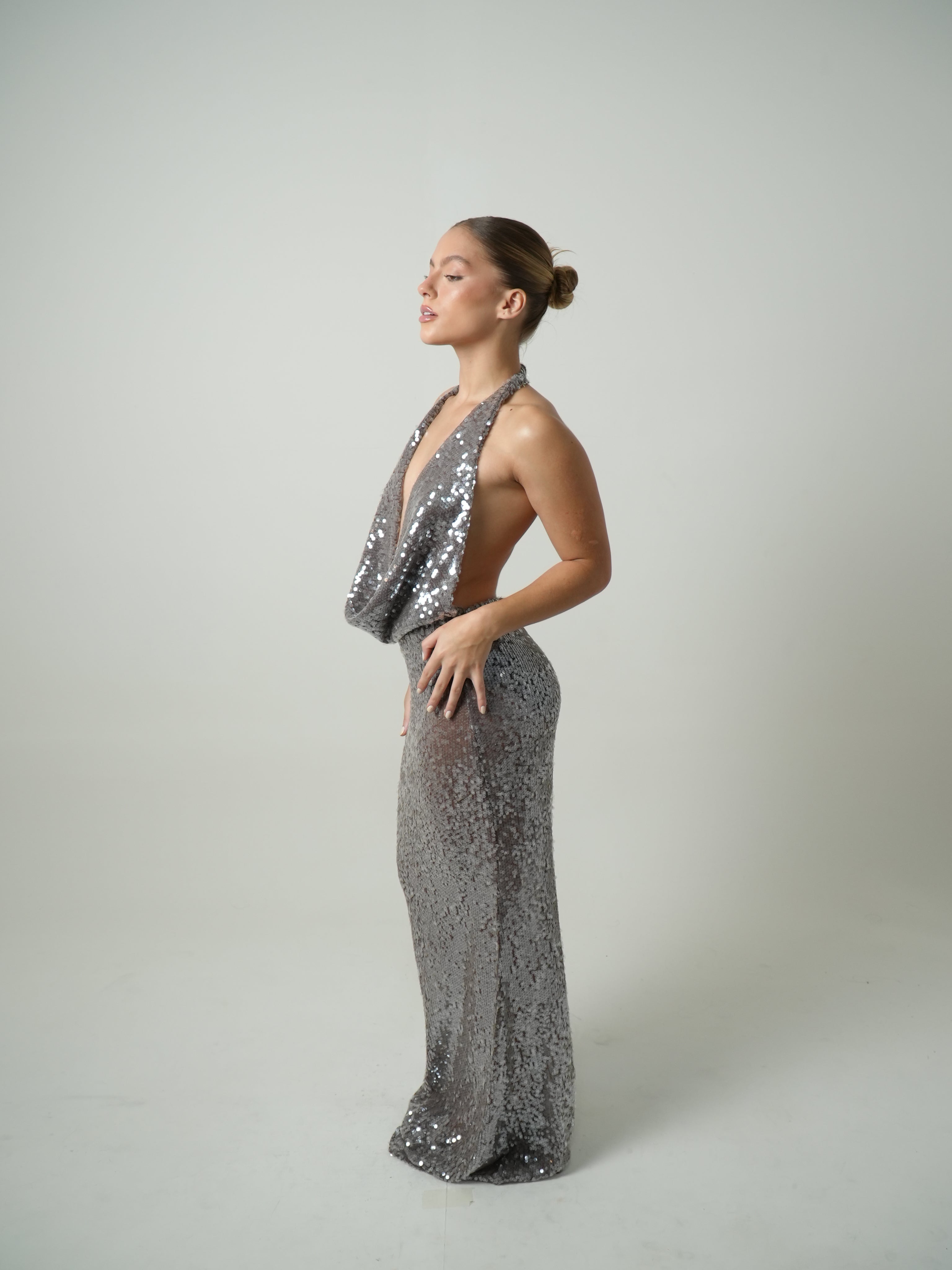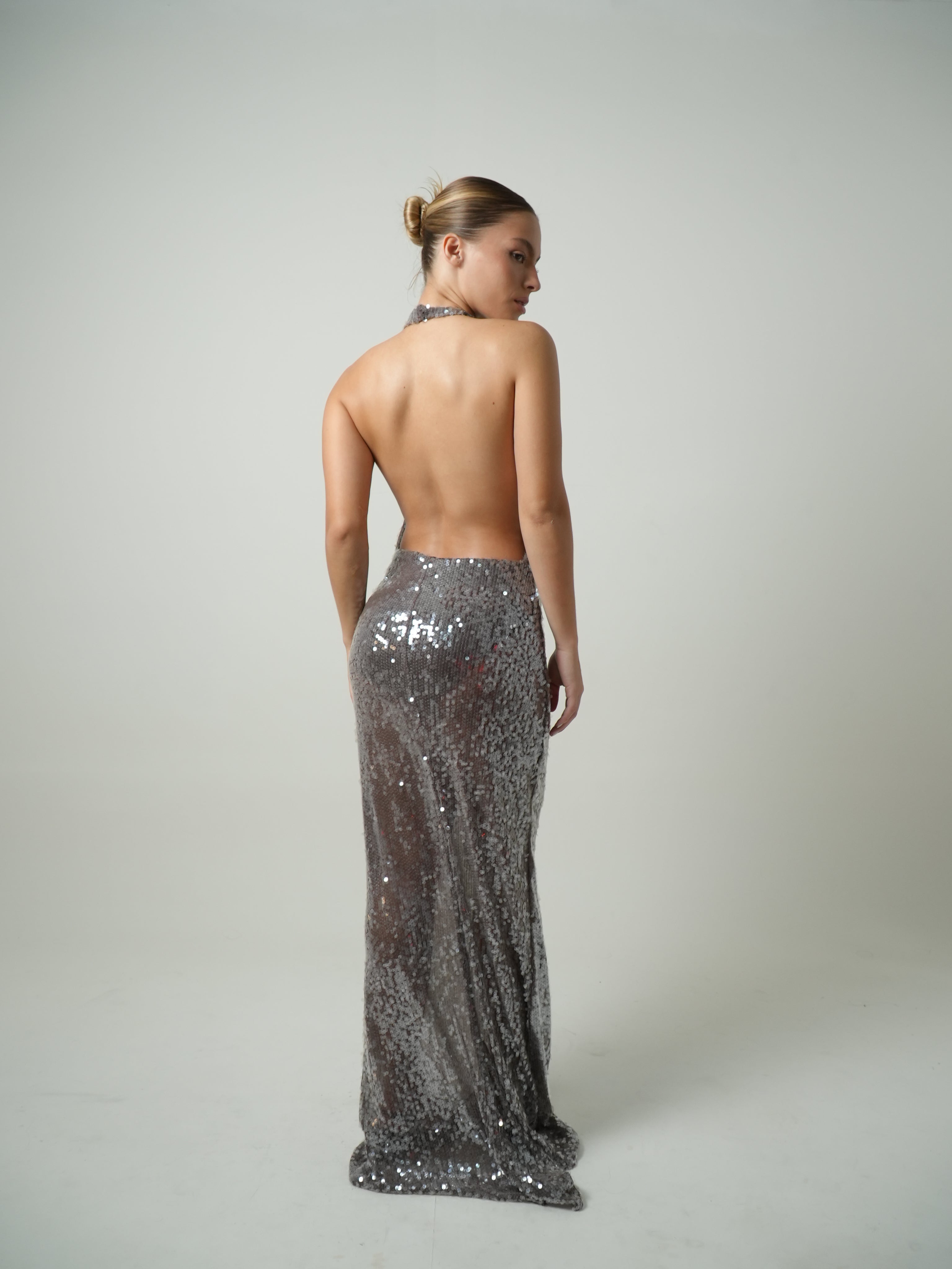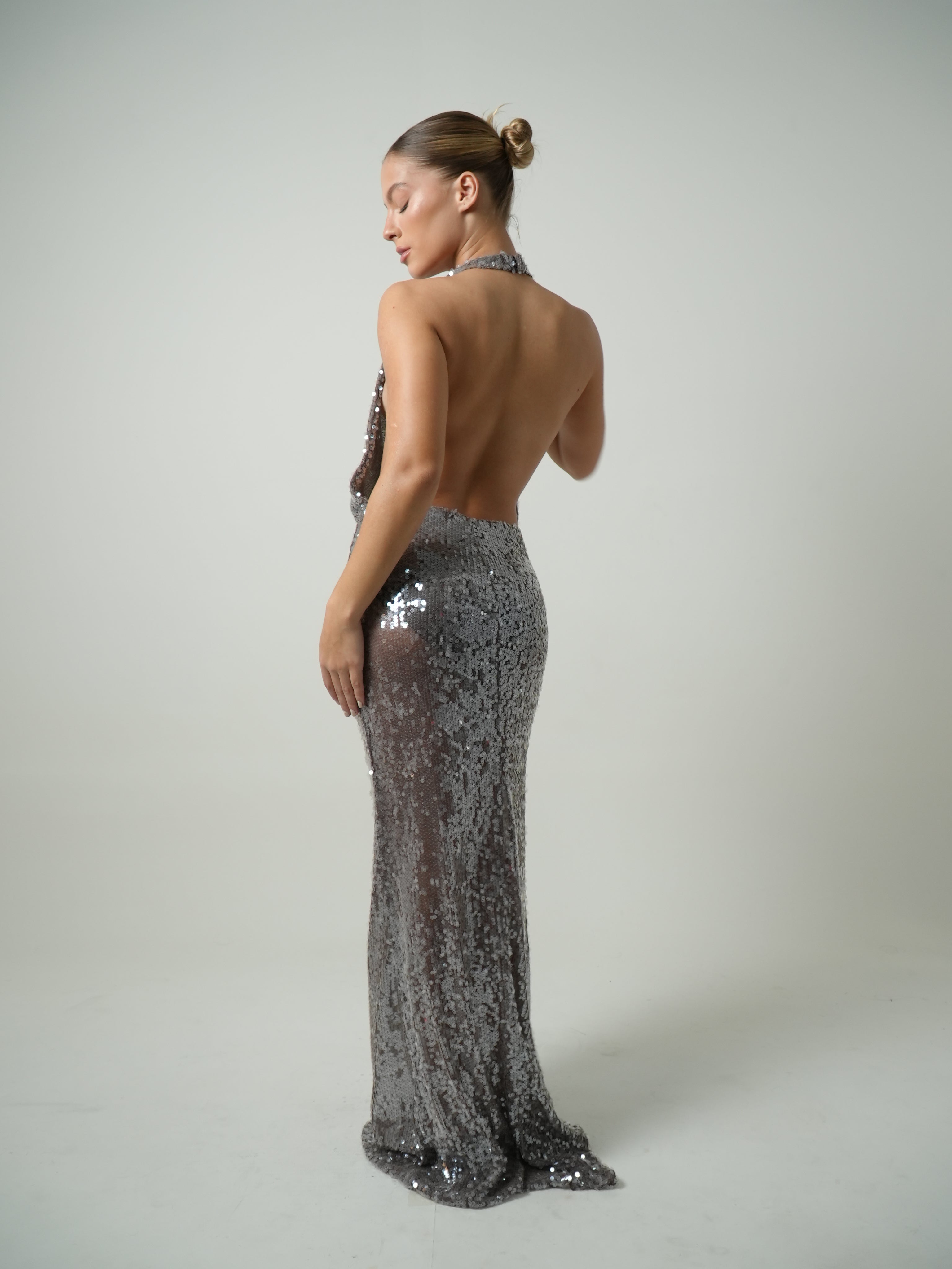 The Glow Long Dress is made of sequins with a "wet" and super shiny appearance. The dress has a plunging neckline at the bust and a zipper at the neck.