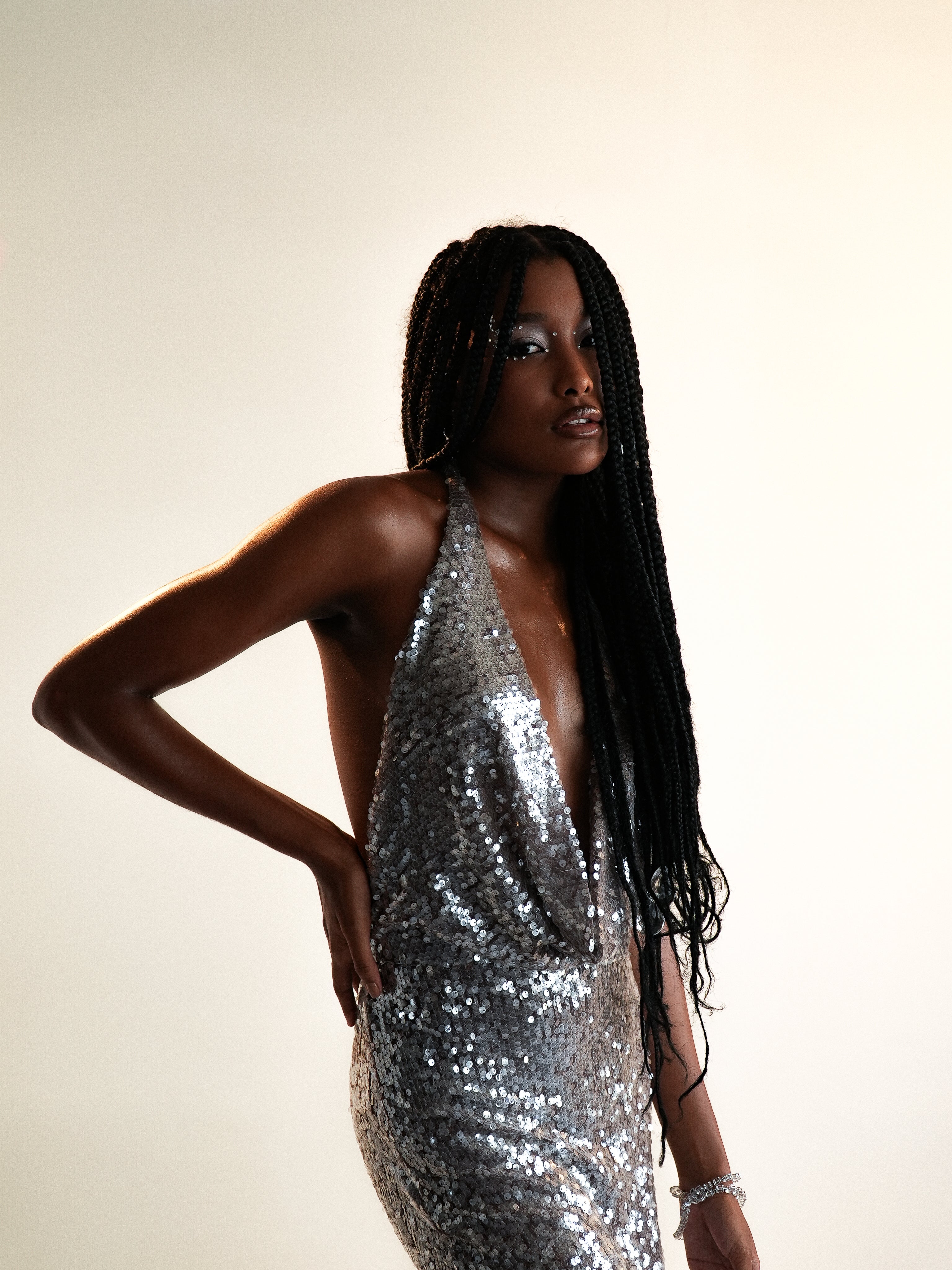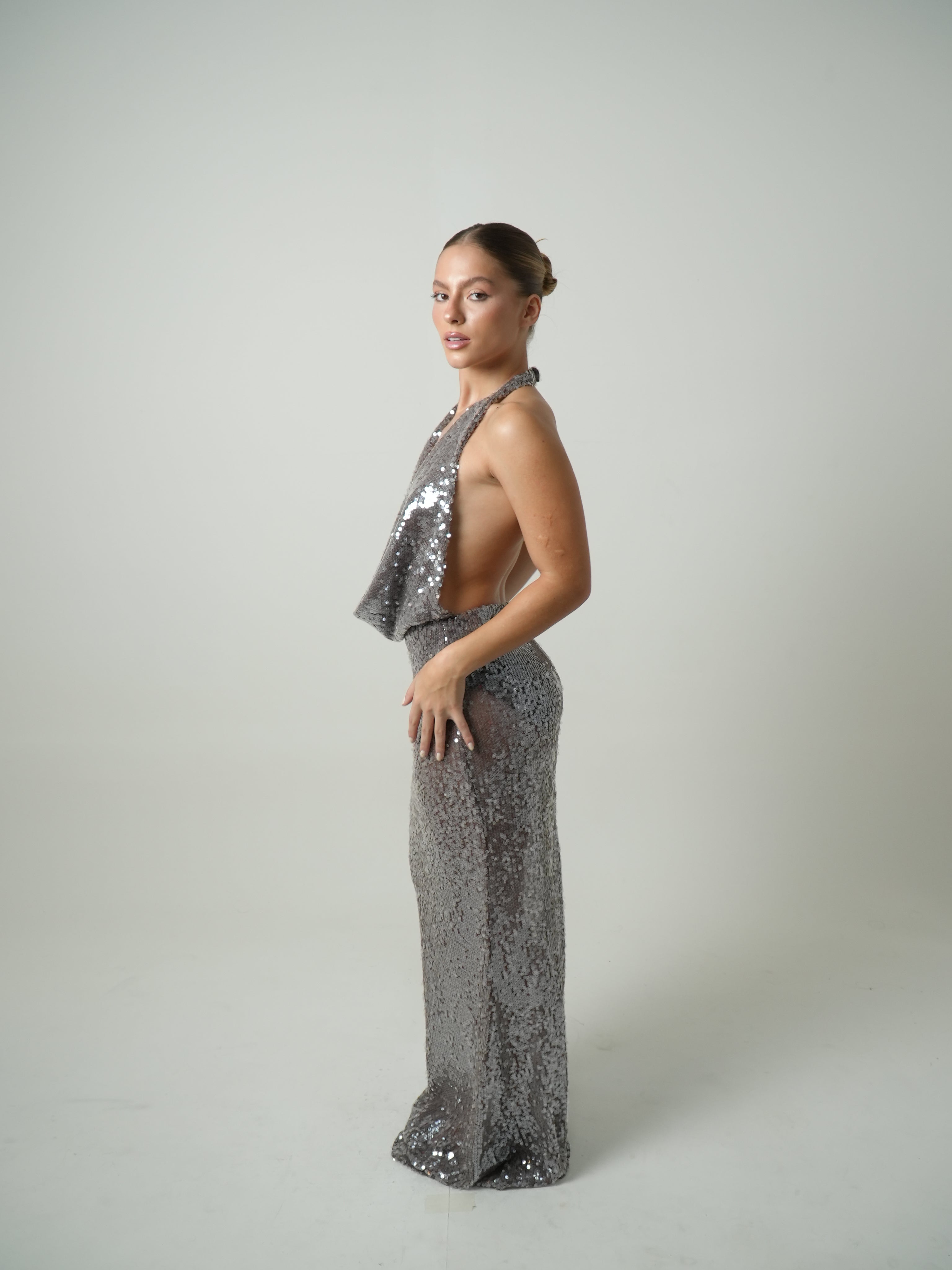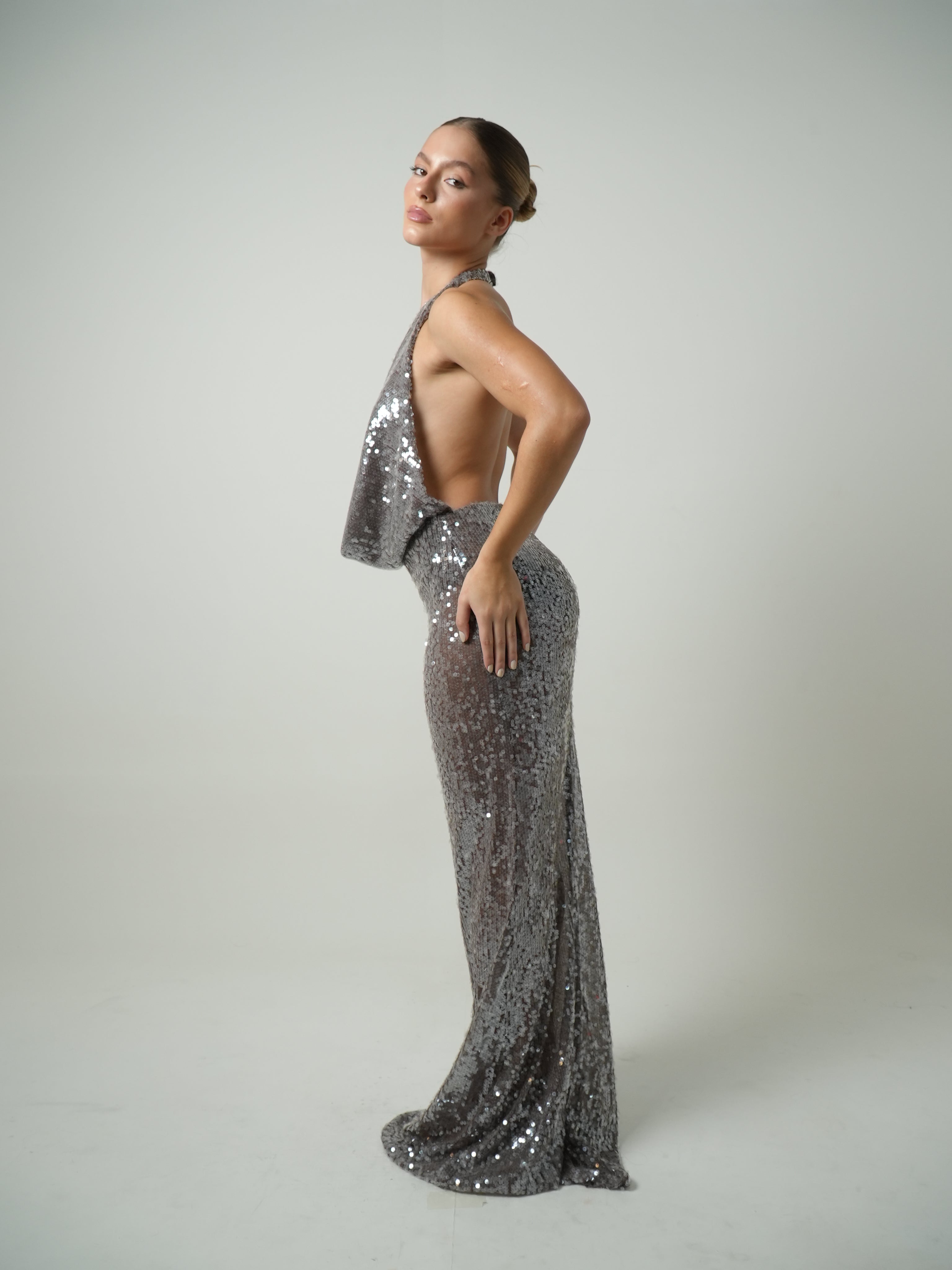 The Glow Long Dress is made of sequins with a "wet" and super shiny appearance. The dress has a plunging neckline at the bust and a zipper at the neck.