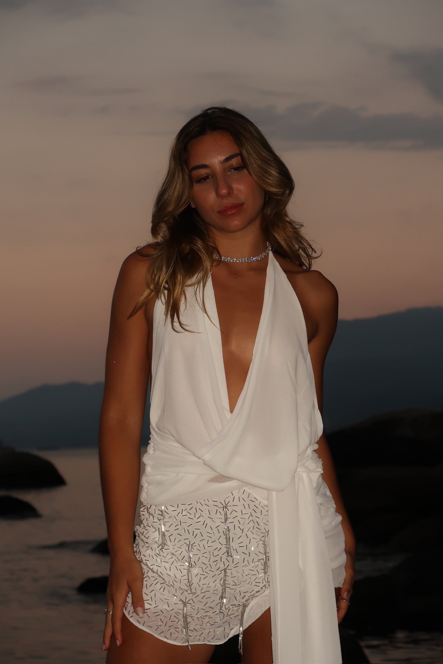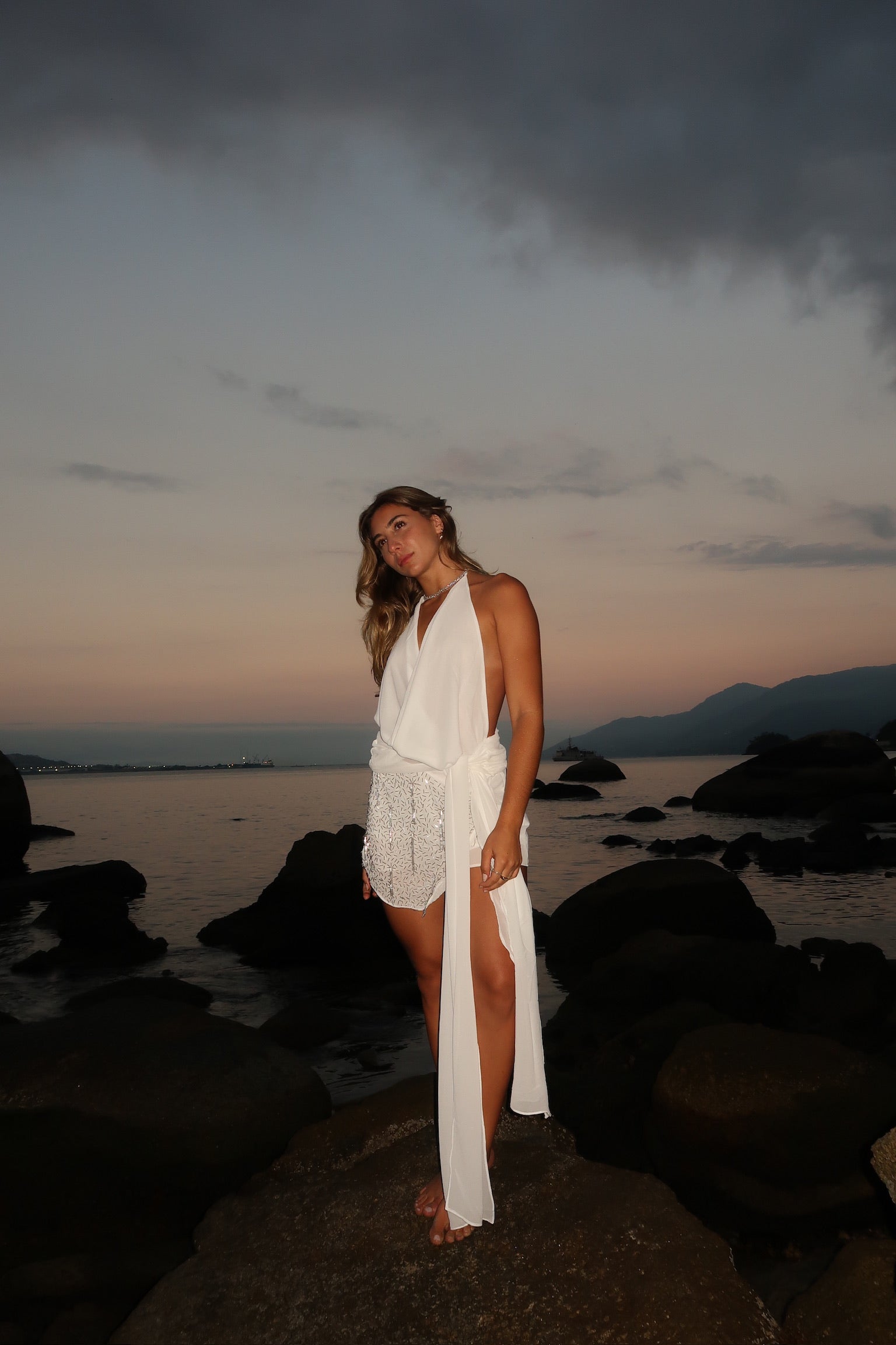 Mini saia stardrops Branca (edição limitada) é o verdadeiro work of art, mais de 100 canutilhos bordados a mão por saia, um trabalho com muitos detalhes e extremamente impecável. Nessa edição limitada e especial da saia stardrops mudamos a cor dos canutilhos para cristal prata que casou perfeitamente com o Branco do tecido.