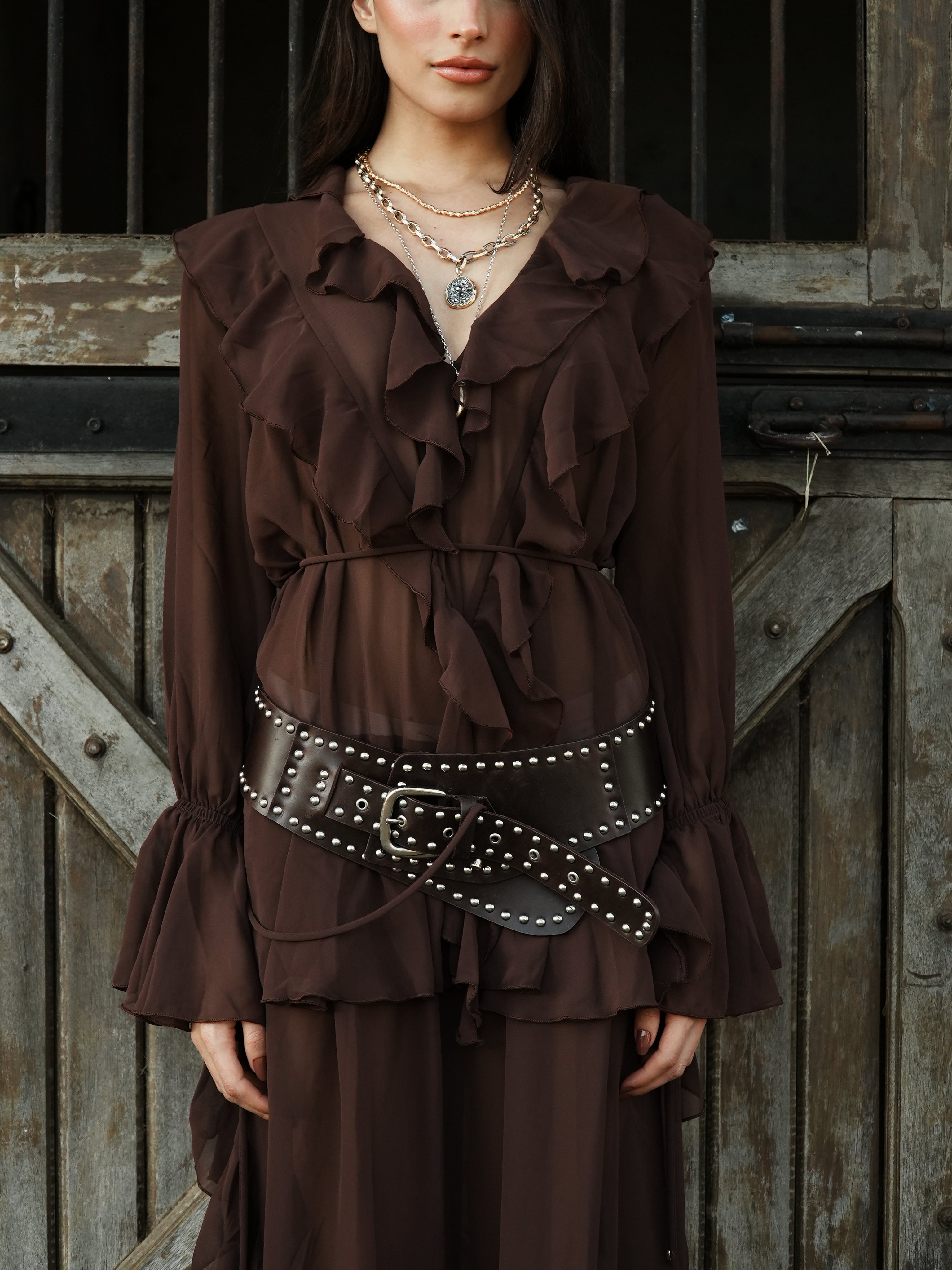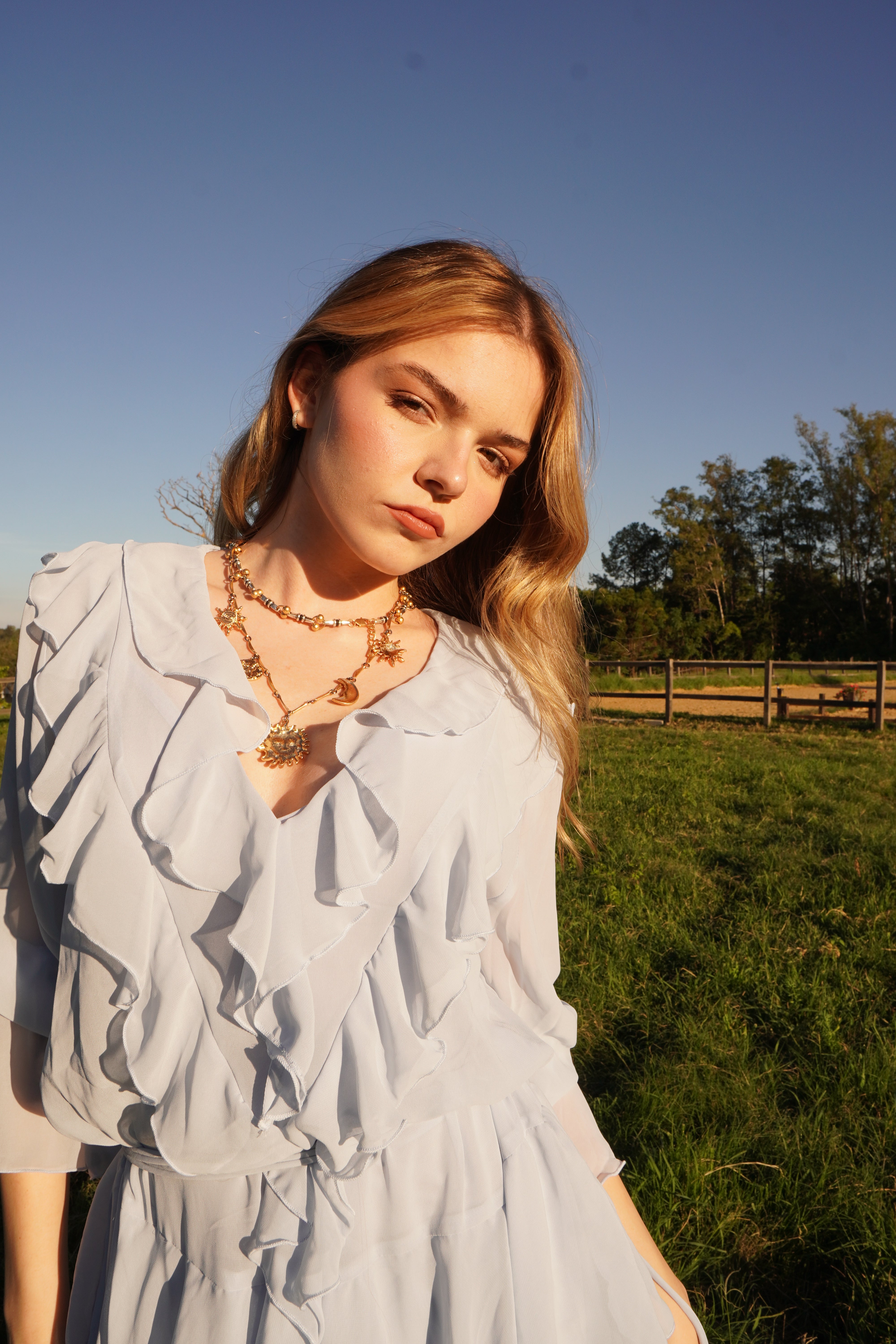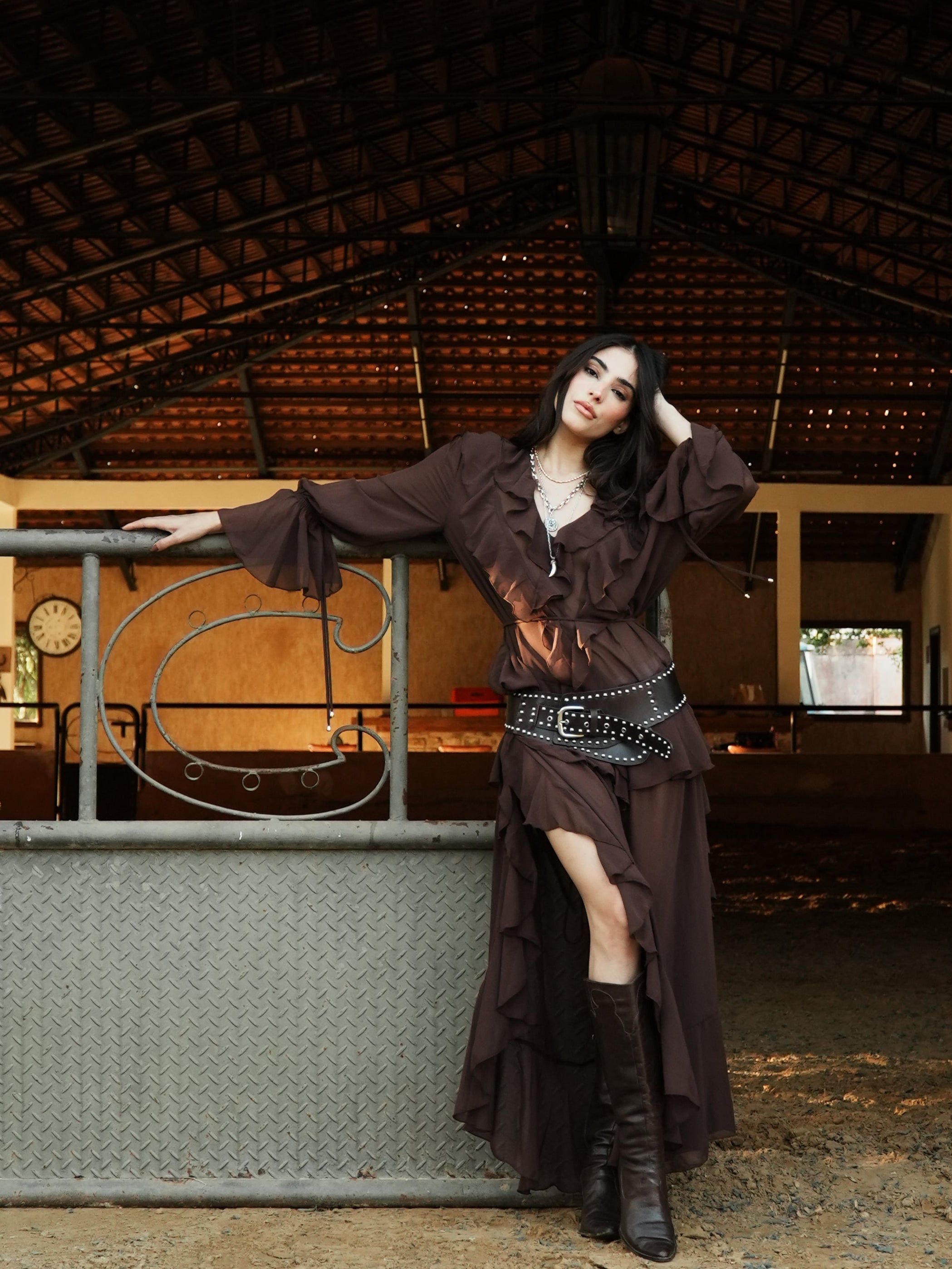 Vestido Longo em tecido chiffon, acompanha sleep dress pra usar por baixo da peça. A peça possui amarrações com ponteiras em metal no decote. A peça possui detalhe de fenda na lateral.