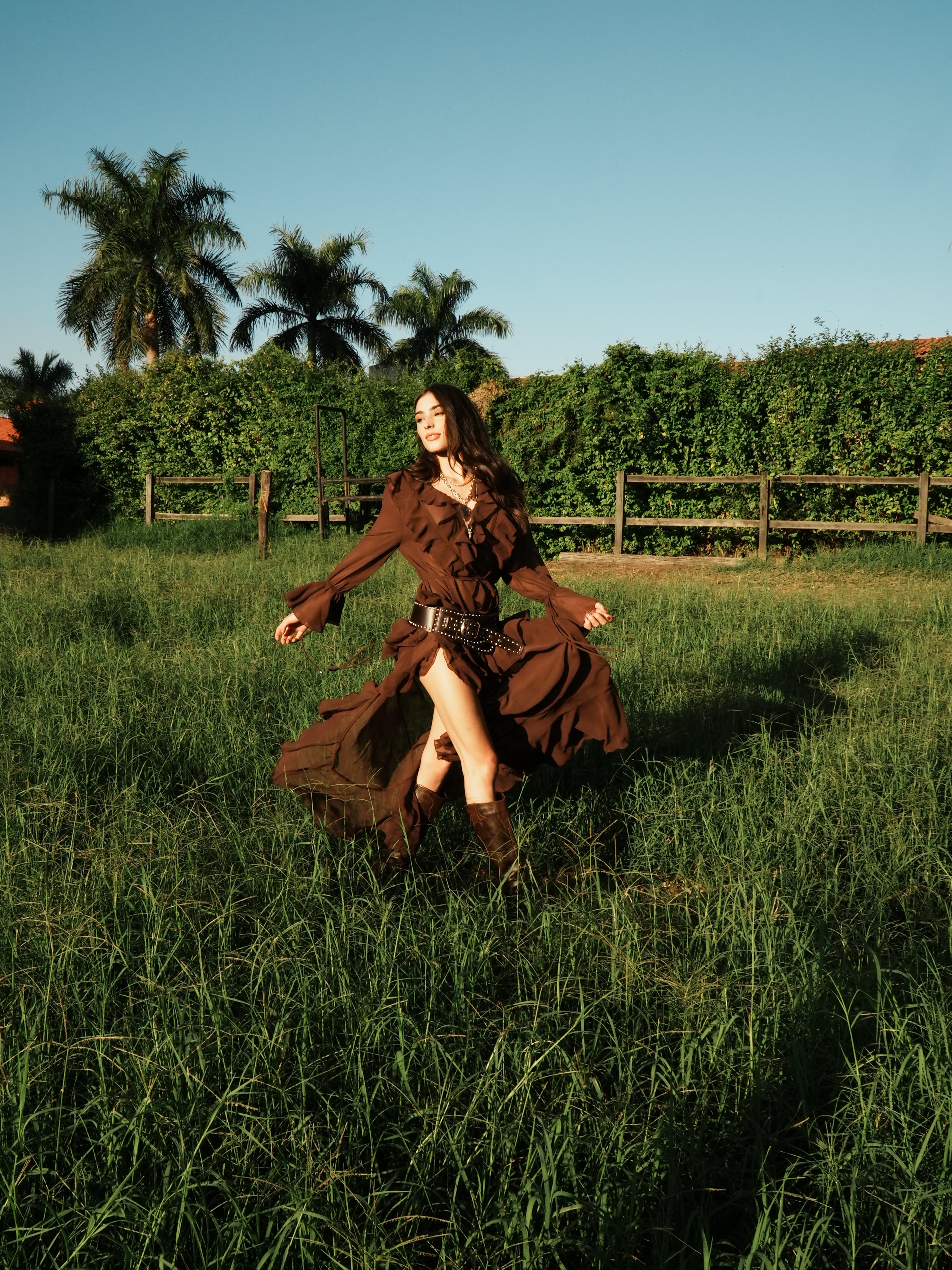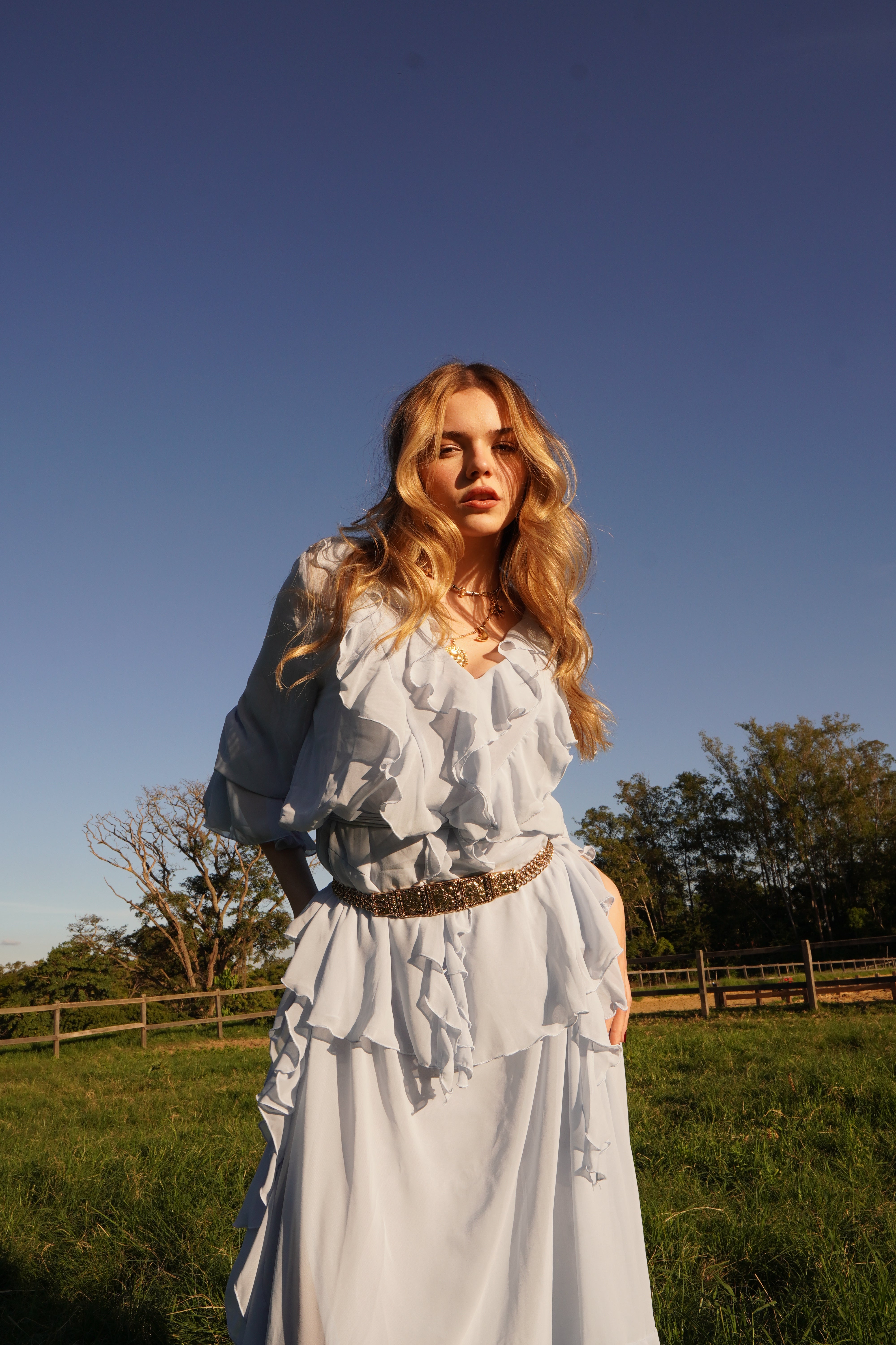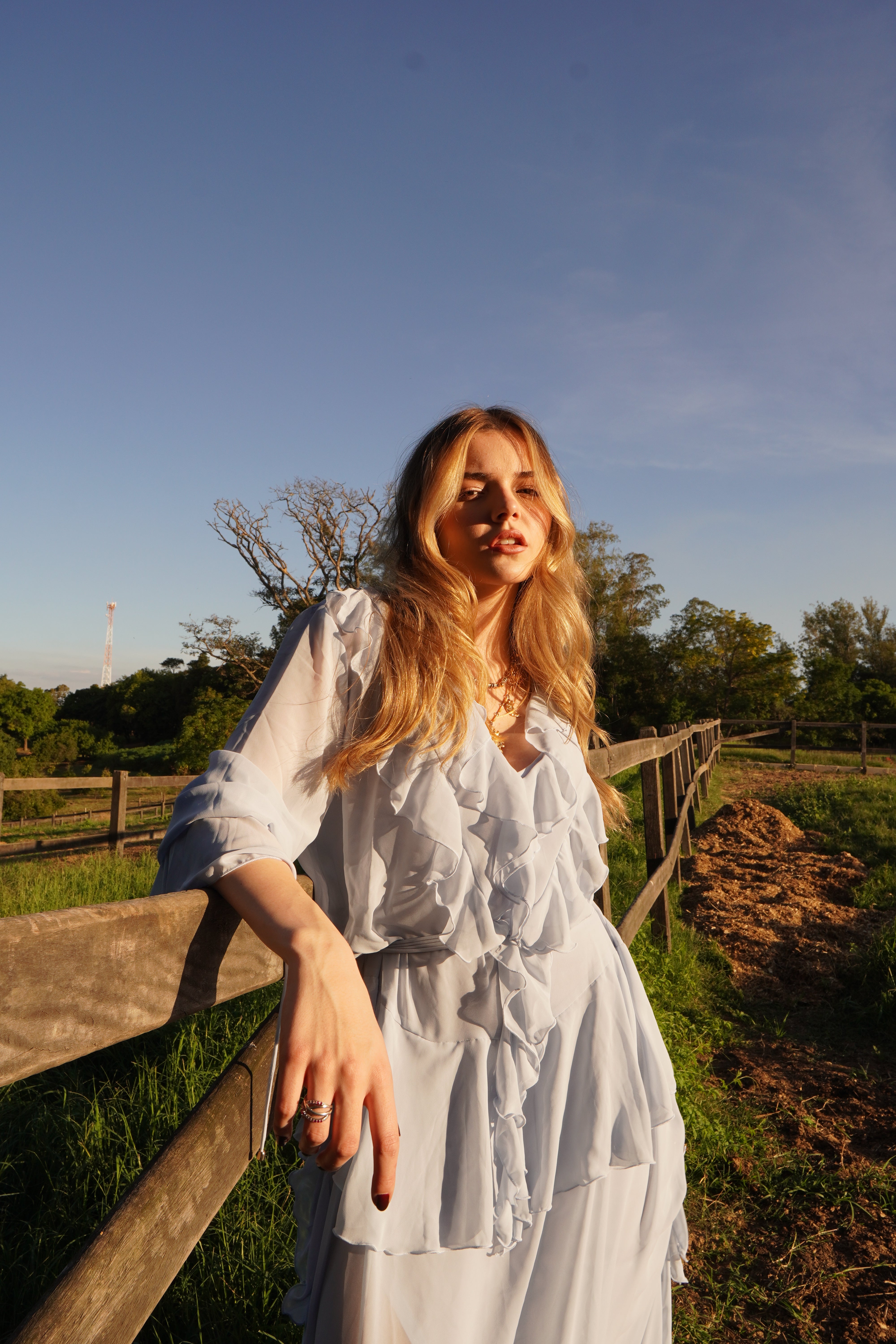 O tecido chiffon é leve com certa transparência, ele é um tecido fresco e que dá a fluidez perfeita que o vestido pede.