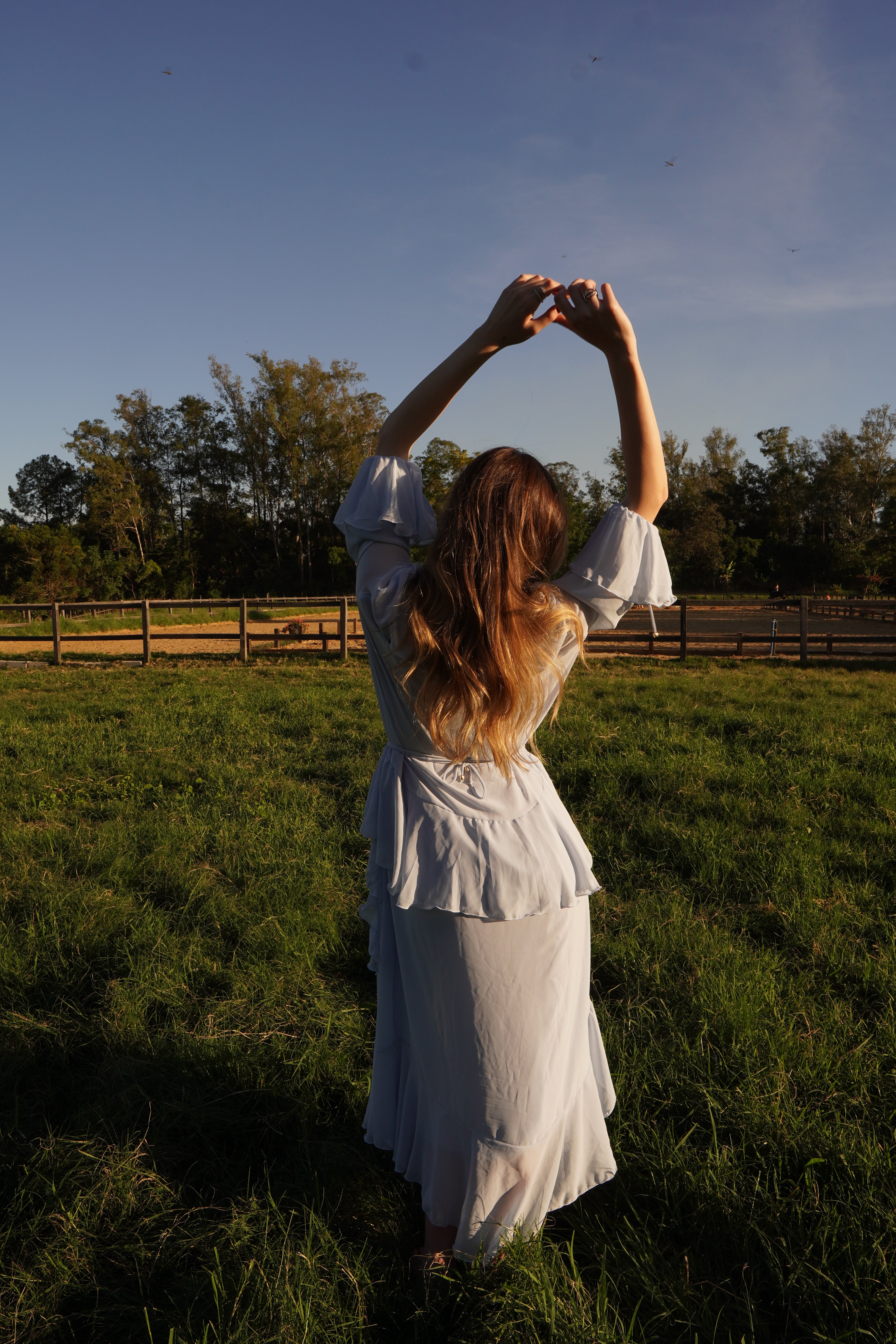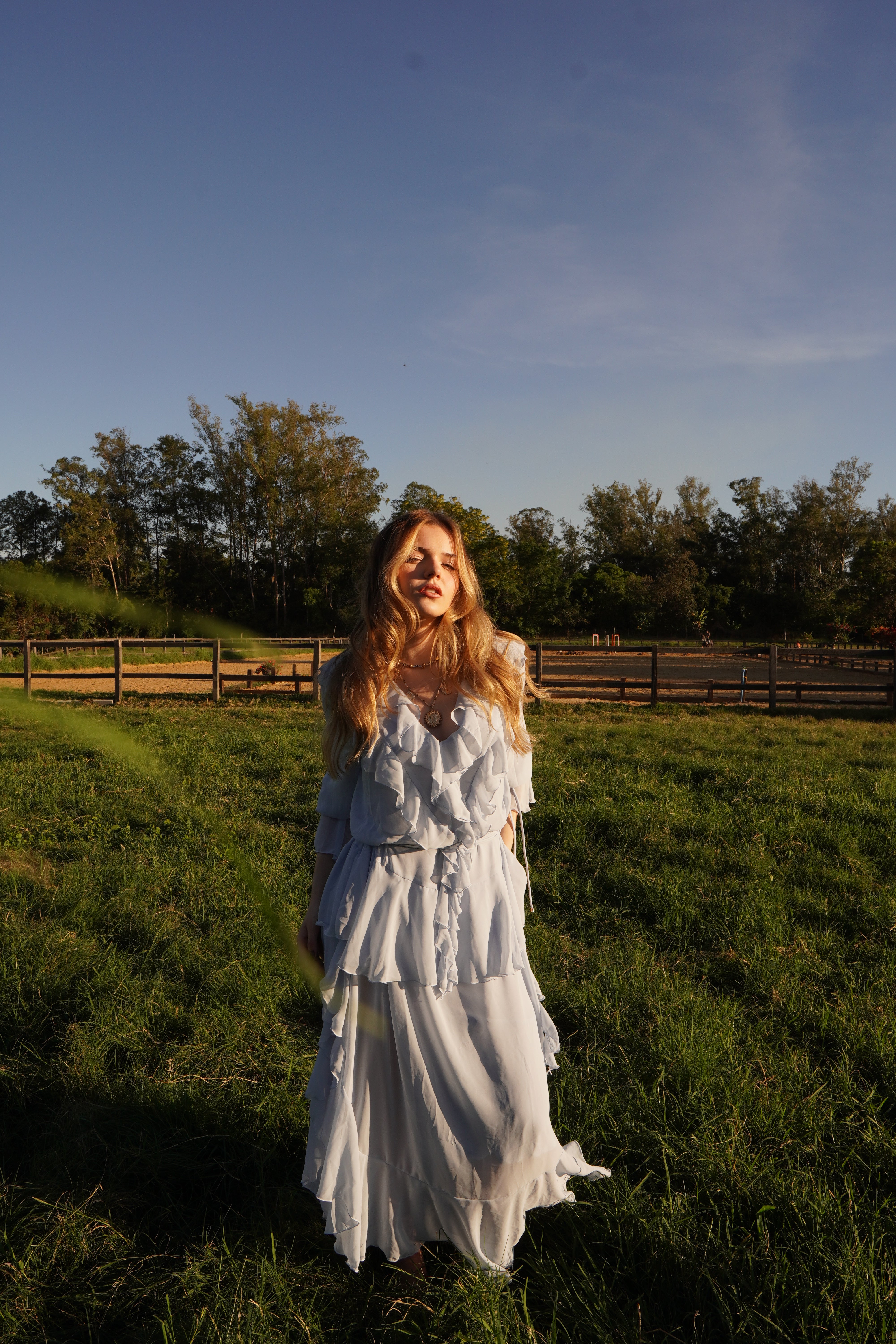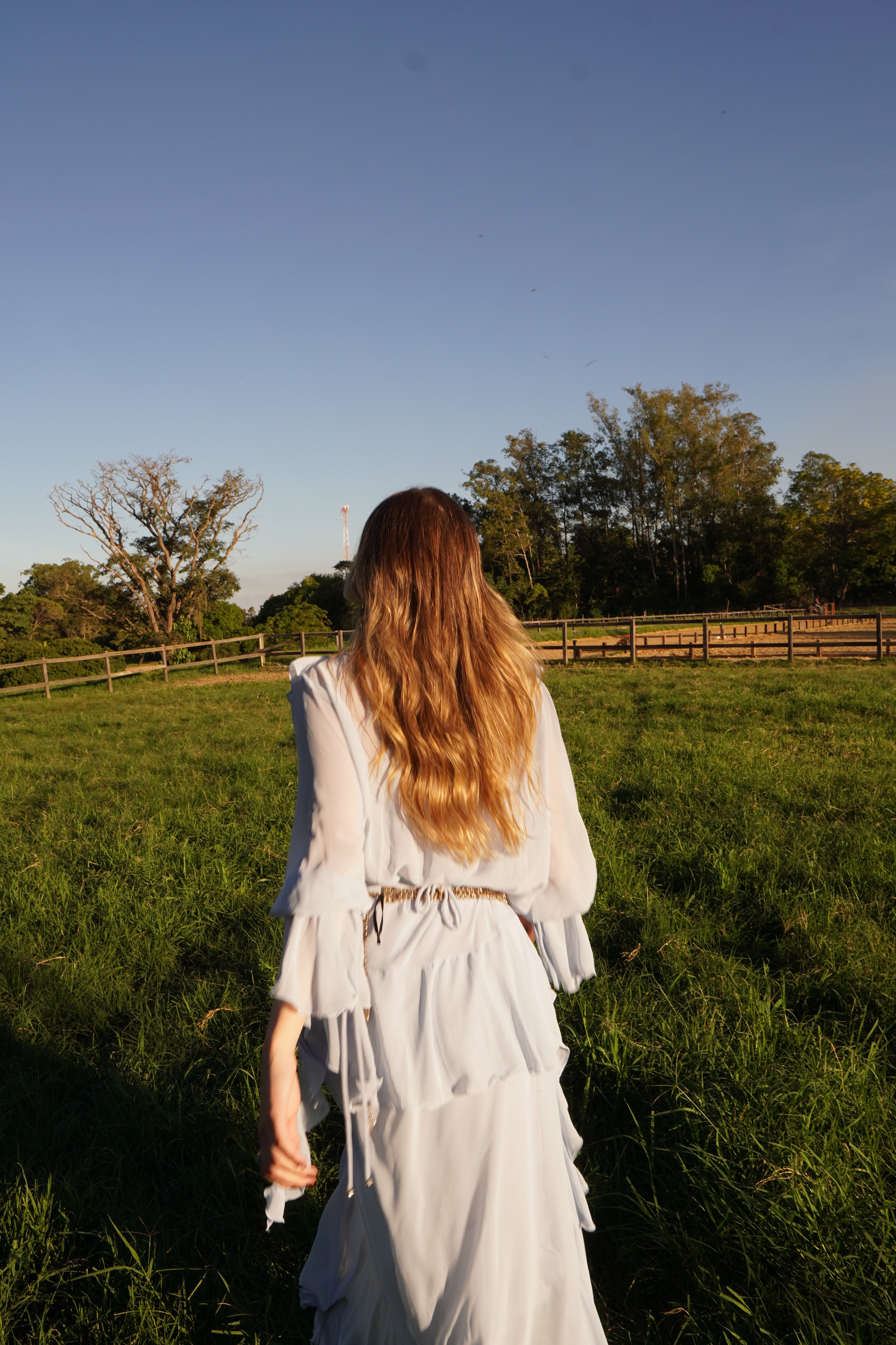 O tecido chiffon é leve com certa transparência, ele é um tecido fresco e que dá a fluidez perfeita que o vestido pede.