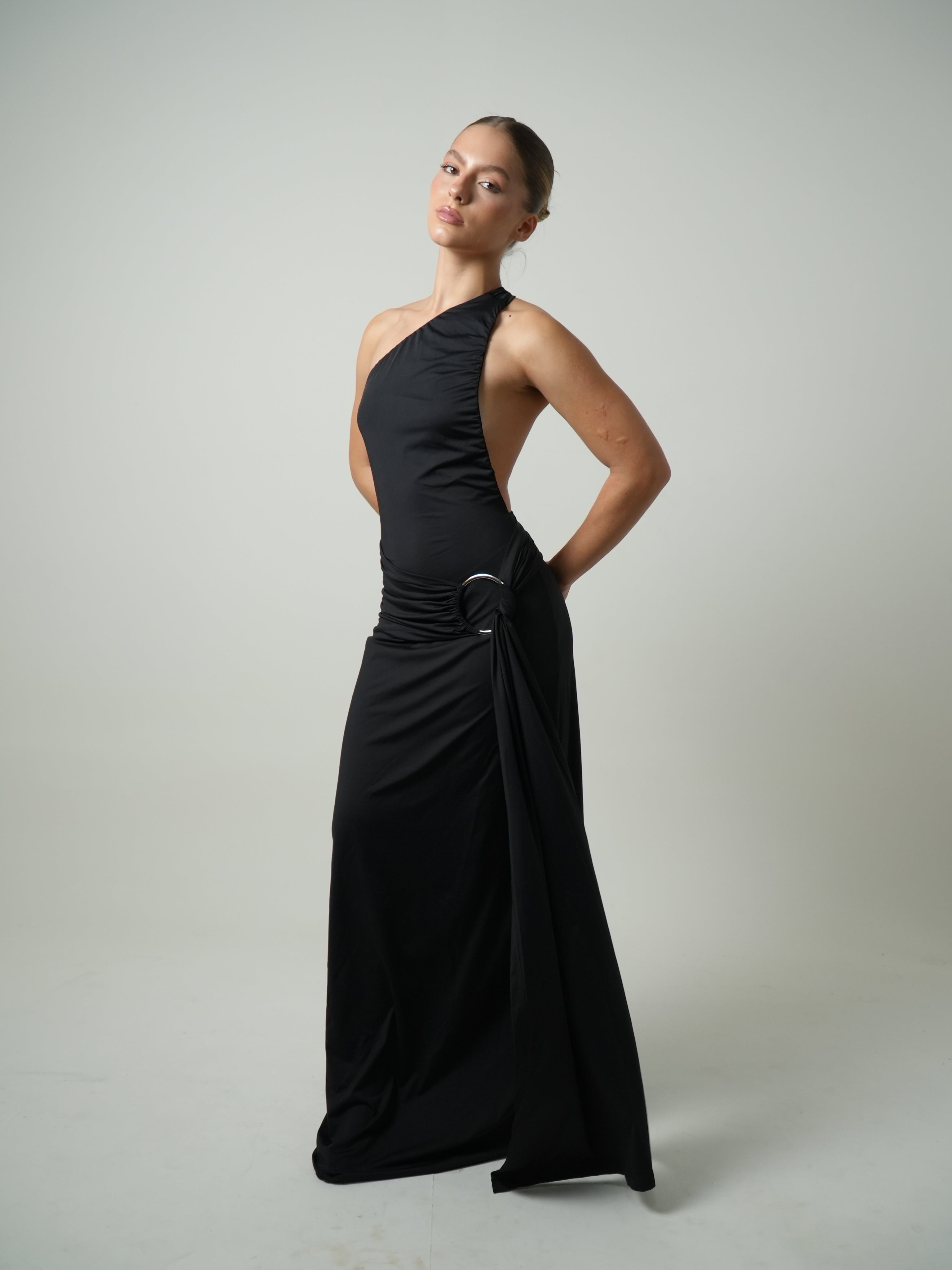Nas costas, um detalhe ajustável com regulador de metal permite o ajuste perfeito. E o grande destaque do vestido fica por conta da argola lateral com faixa de tecido.